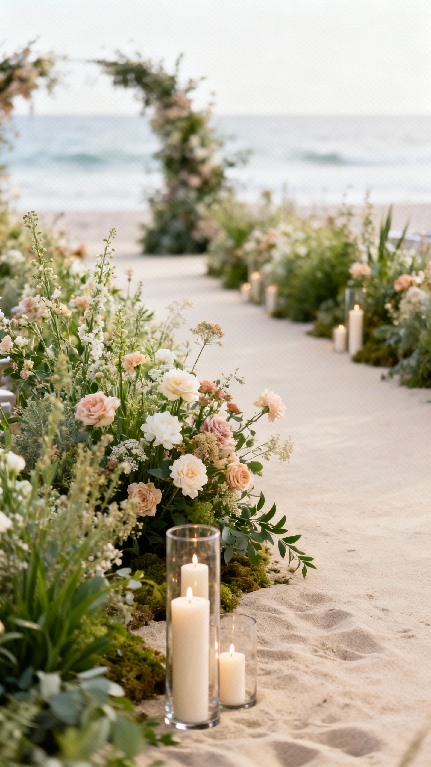 If you want a dreamy walk down the aisle, skip the tiny bows and go for floral “meadows” along the edges—clusters of blooms and candles at varying heights. This works beautifully for garden, coastal, and even ballroom weddings because it feels layered in photos. Keep the arrangement bases hidden with greenery so it looks effortless, not staged.