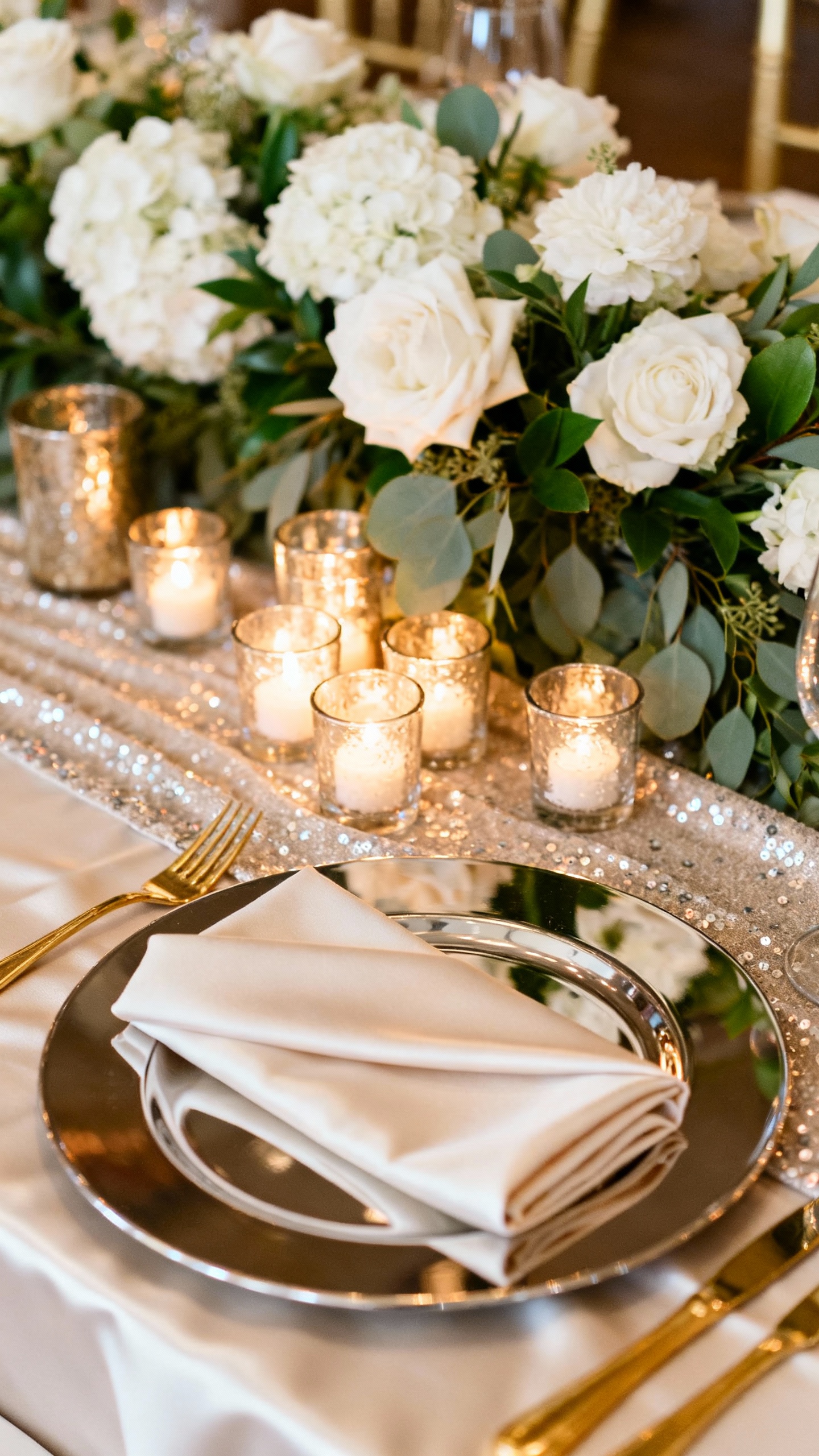 Mix satin linens with a subtle sequin runner or napkins for a layered, high-end look that doesn’t feel busy. Keep the centerpiece low and luxe: clustered votives, soft white florals, and a few metallic bud vases. This is a super easy way to make the head table look expensive without needing a full floral wall.