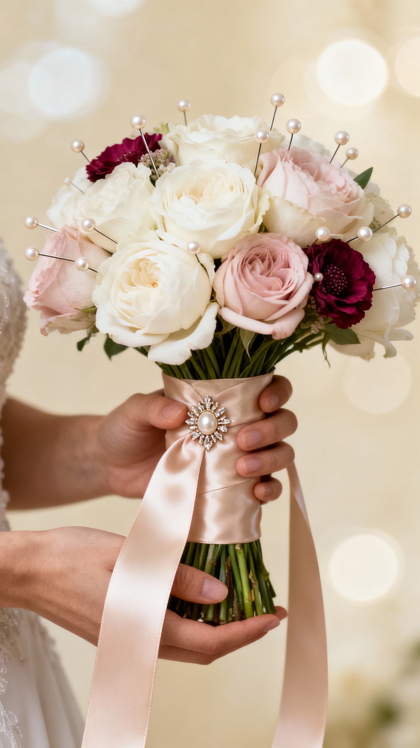 Choose one consistent finish across the wedding party, like satin ribbons on bouquets, matching metallic hair pins, or coordinated sparkle accessories. Even if dresses vary, repeating a single glam detail makes everything look cohesive. Bonus: it’s an easy checklist item for bridesmaids and moms.