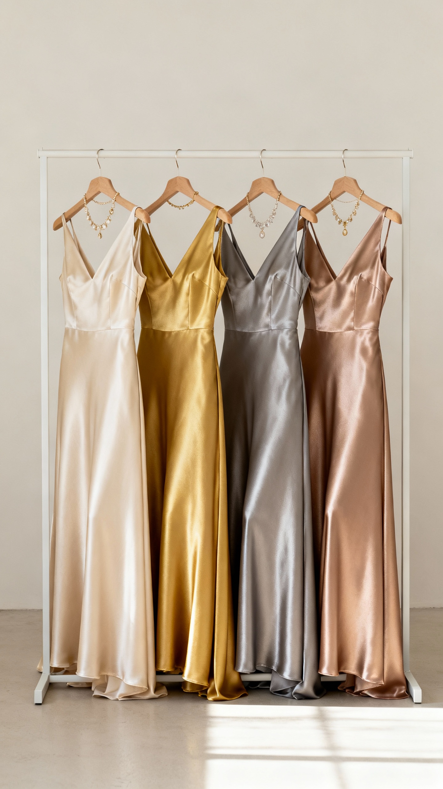Instead of forcing everyone into the exact same shine level, mix metallic tones like champagne, gold, pewter, and soft bronze within the same fabric family. The trick is to keep the silhouette or length consistent so it reads cohesive in photos. It’s especially stunning for evening weddings and candlelit venues.