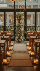- Ceremony at a focal spot (bar, window, or wall), with standing guests or seated at tables.