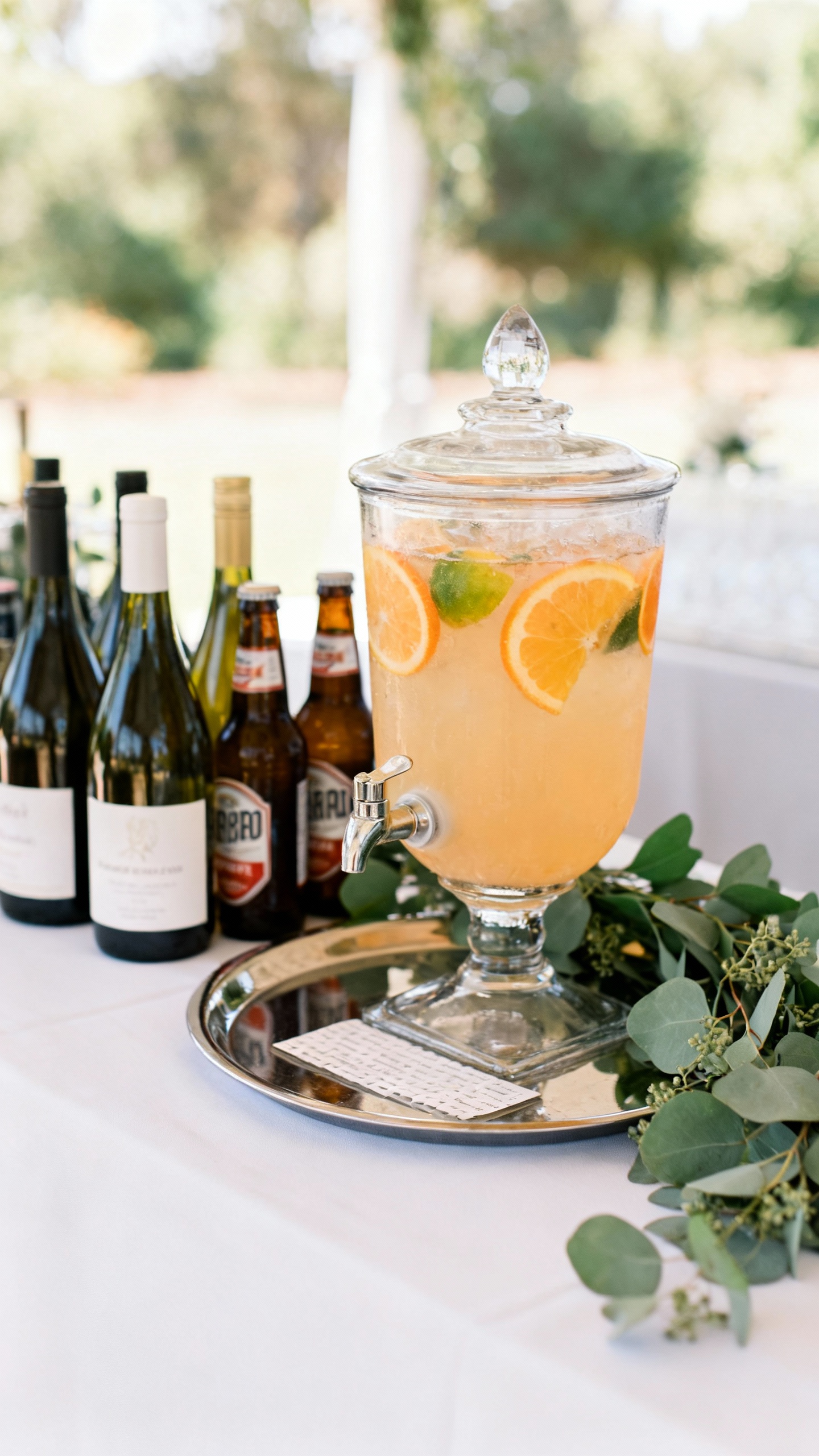 A full liquor bar for six hours is a major line item, and most guests don’t care about top-shelf options. Offer beer and wine plus one or two signature cocktails that match your aesthetic (his/hers, or “spicy” and “sweet”). If you want to be extra thoughtful, include a fun non-alcoholic option like a sparkling lemonade or mocktail. Your bar still feels generous—just not unnecessarily expensive.