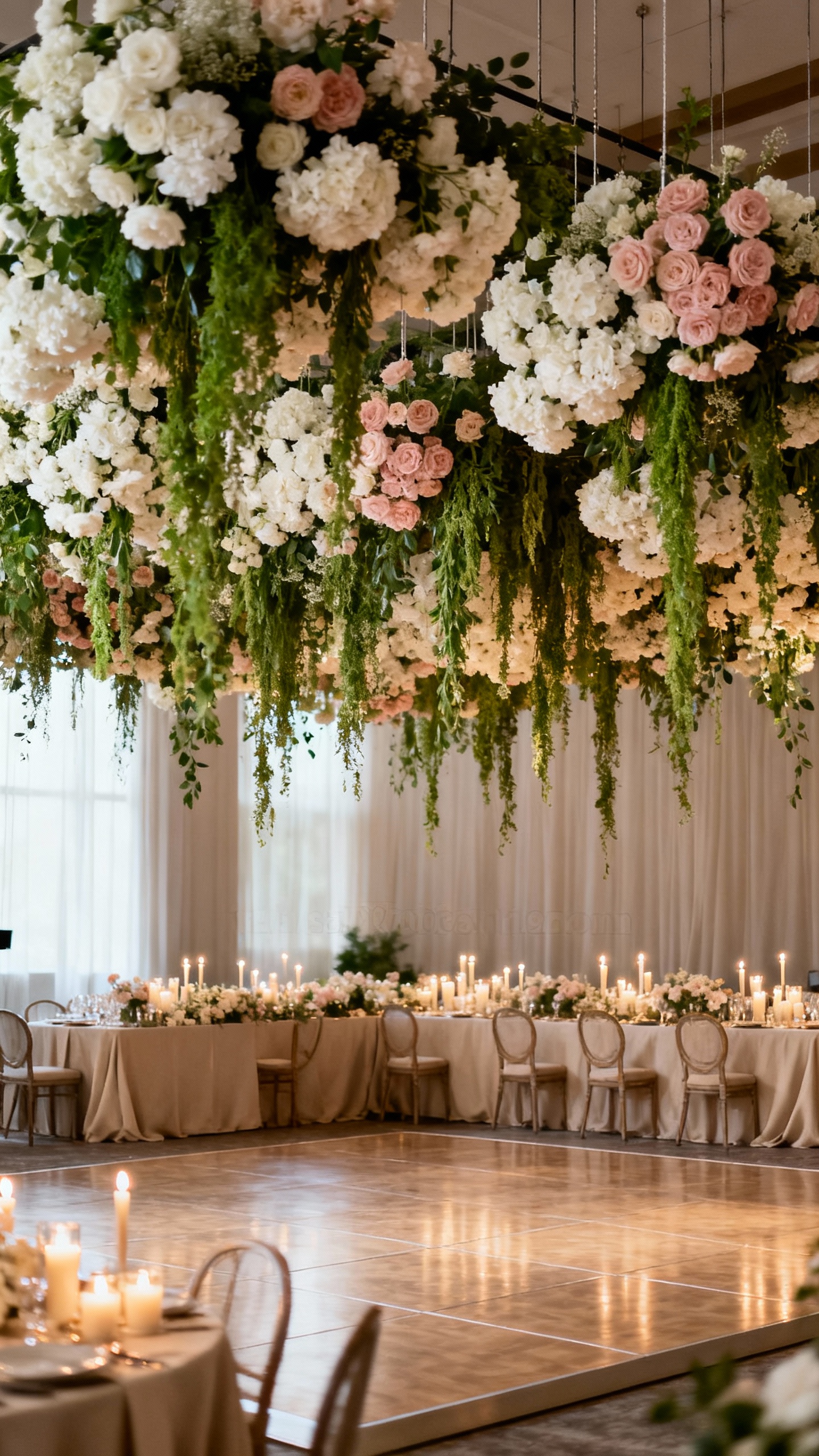 Yes, when they’re installed by professionals with approved rigging and proper weight limits. Always confirm your venue’s rules, ceiling height, and load capacity, and have your planner coordinate with the florist and rental team. Safety and clearance over dining tables and dance floors should be part of the design plan from day one.
