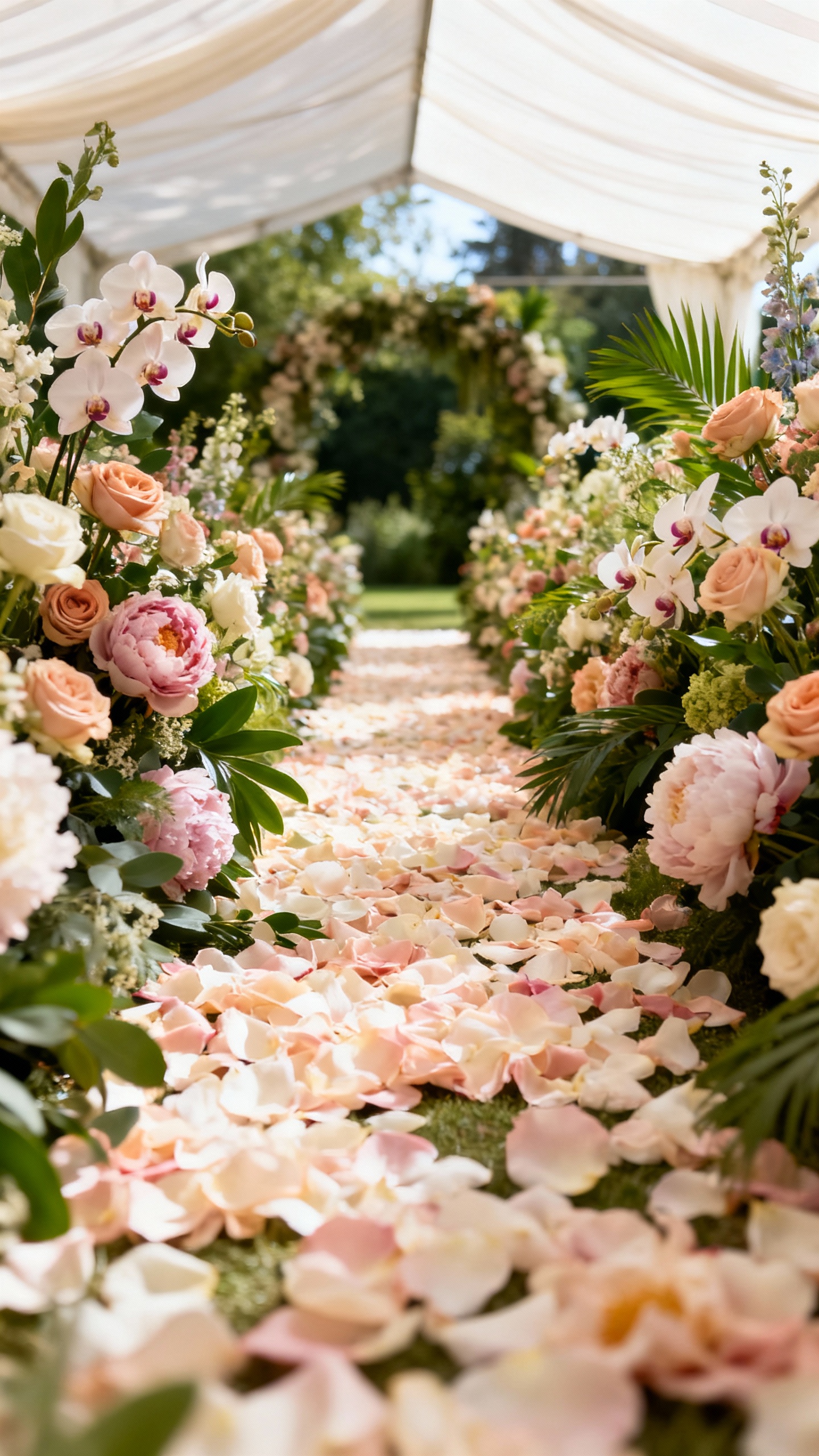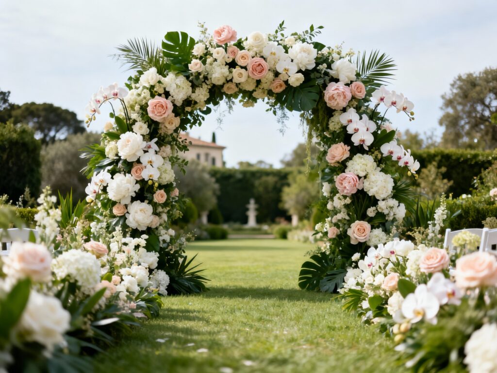 A fully covered floral arch instantly reads luxury because it looks abundant from every angle. Choose large blooms (garden roses, peonies, orchids) plus layered greenery so it doesn’t feel flat in photos. Pro tip: ask for “camera-facing density” so the front is lush while the back is designed more lightly to save stems. It’s also a perfect move if your ceremony space needs a focal point.