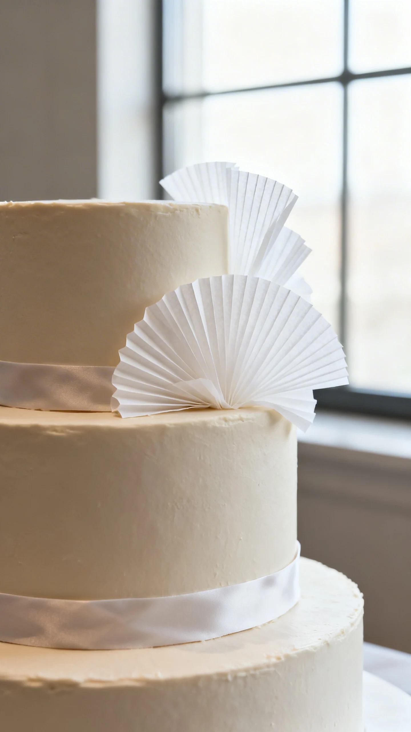 Wafer paper can create movement and texture without heavy piping or bright color. Keep it minimal: a few ruffles on one tier, a soft wrap, or a small accent that echoes your dress fabric. White-on-white wafer paper reads clean and couture-like. It’s a great choice if you want something artistic that still feels classy.