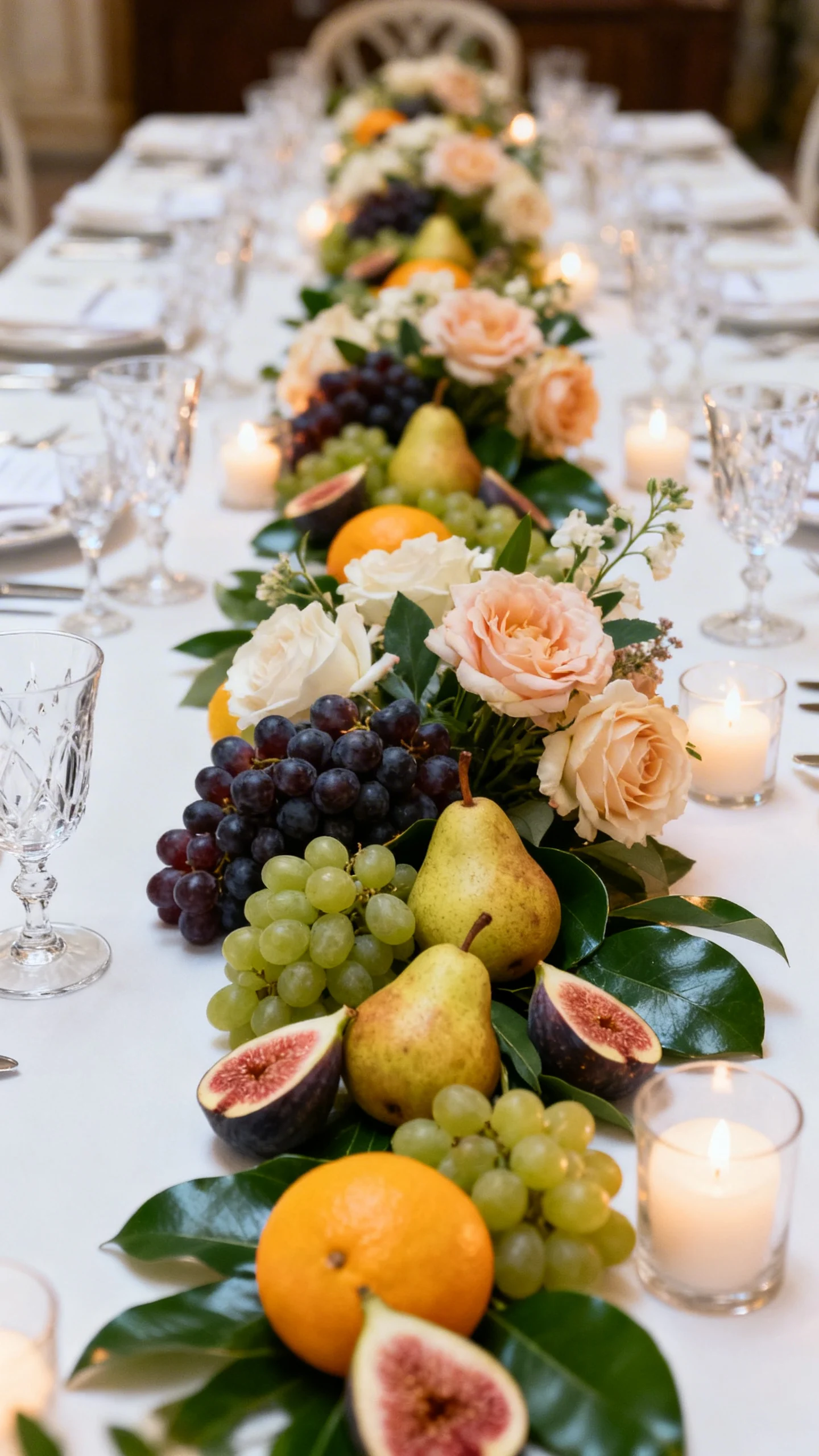 For a European-inspired reception, weave fruit into your florals for a styled “still life” vibe. Think figs, grapes, pears, citrus, or pomegranates nestled among blooms and greenery. The key is to keep it curated: choose one or two fruit types and repeat them evenly down the table. Add glossy leaves and soft candlelight to make it feel rich rather than rustic.