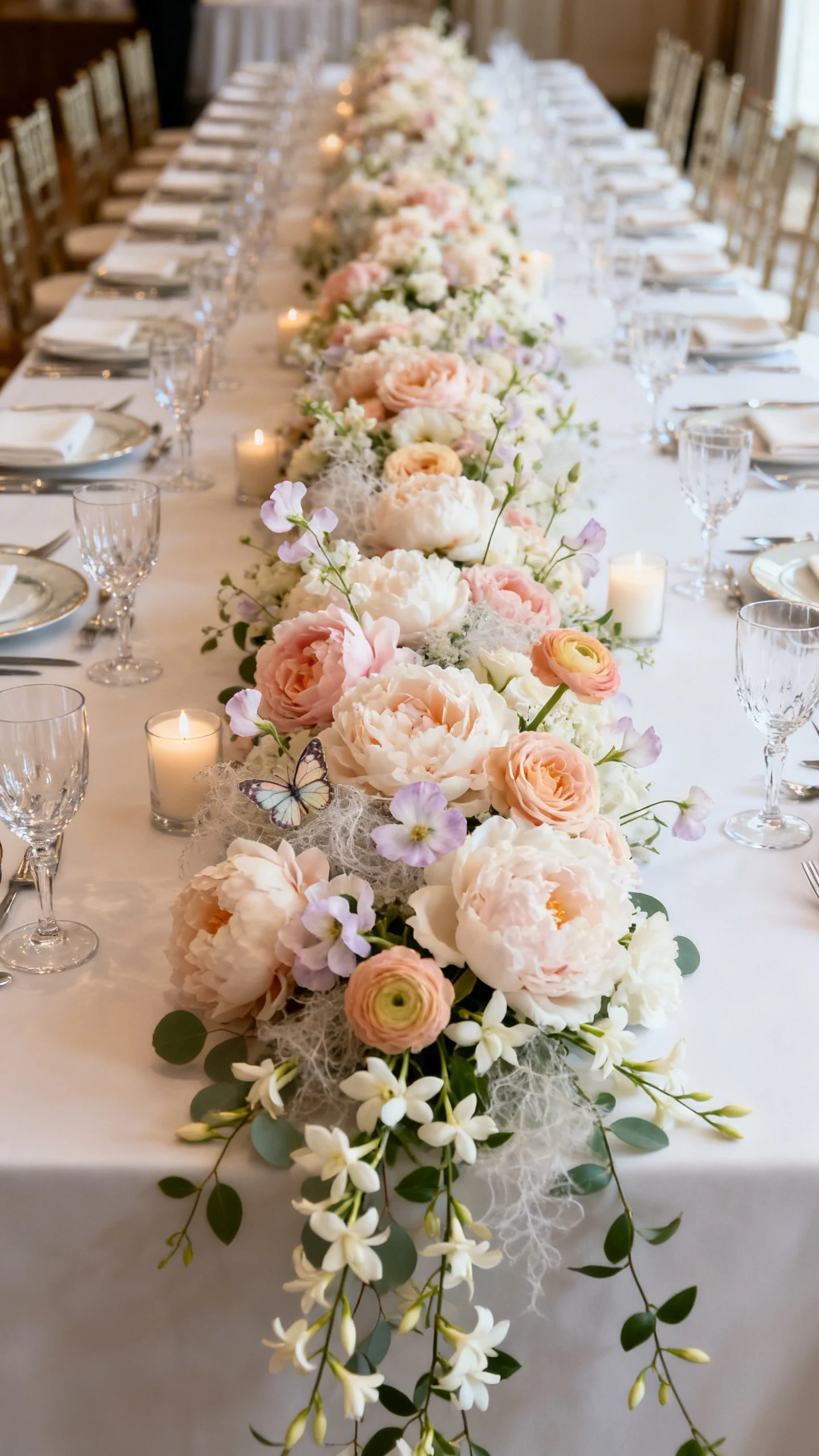 Swap small centerpieces for a continuous floral runner that stretches the full length of the table. Mix fluffy blooms (like garden roses and peonies) with airy ingredients (like sweet pea, butterfly ranunculus, or jasmine vine) for depth. Add layers of foliage sparingly so the flowers stay the star. Keep the runner low in the center so conversation stays easy while the look stays dramatic.