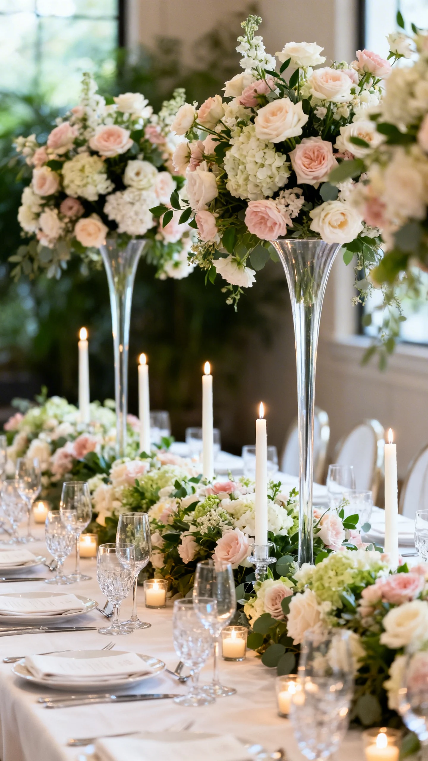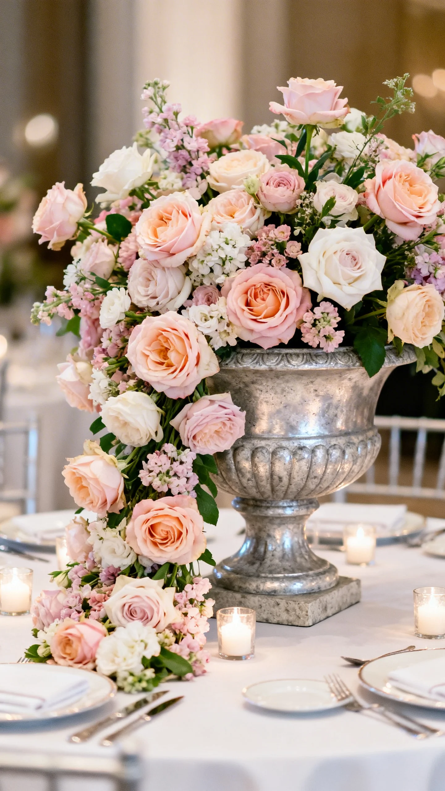 Use oversized compotes or urns as your base, then design arrangements that cascade down the sides onto the tabletop. This creates instant luxury because it looks abundant from every angle. Choose one hero flower in a premium variety, then support it with smaller blooms in the same color family. Ask your florist to keep the spill controlled so place settings still feel clean and intentional.