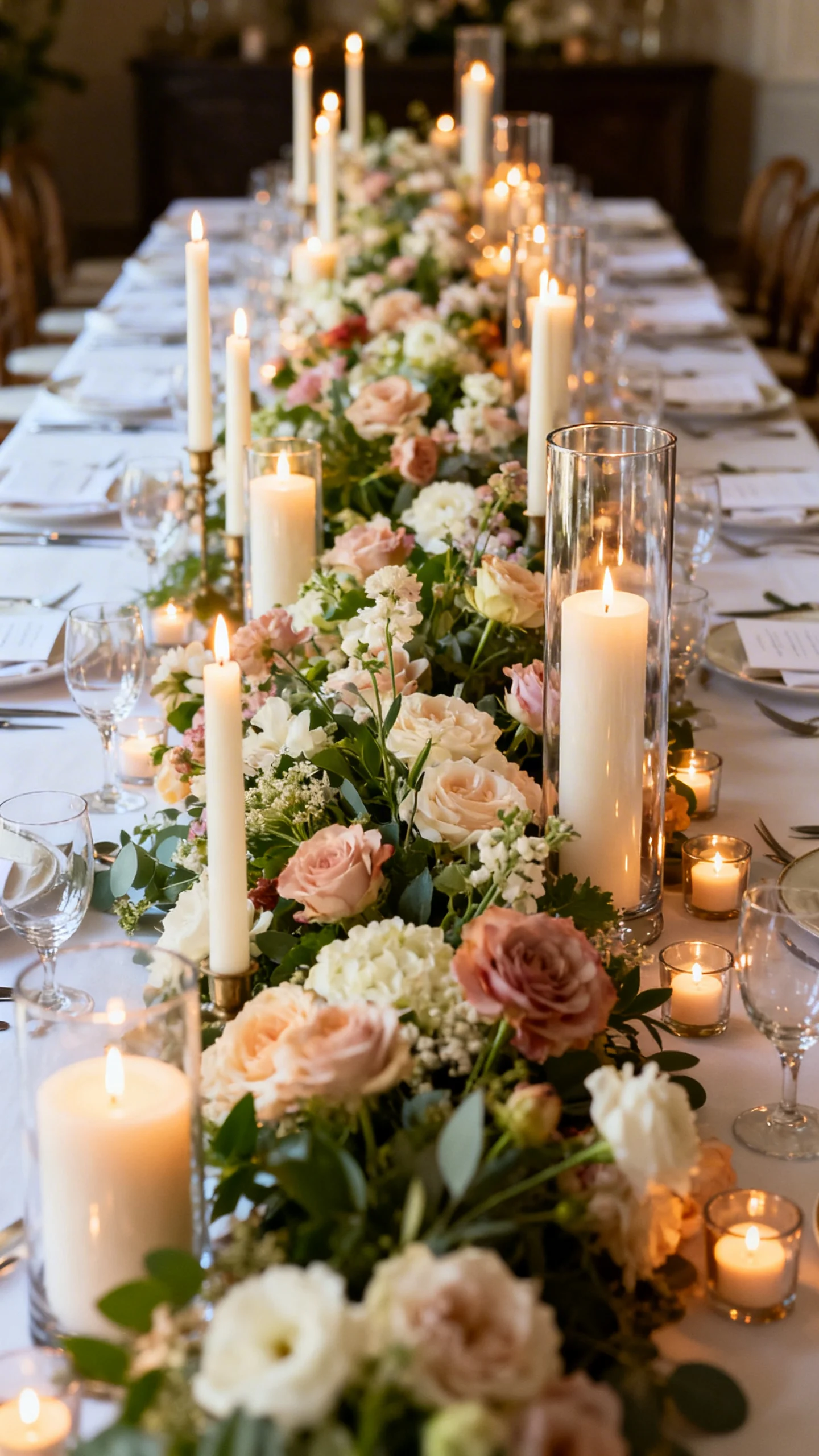 Nothing says “reception romance” like a sea of candlelight woven through flowers. Use a mix of tapered candles, pillars in hurricanes, and petite votives tucked into the floral line. Keep flames at varying heights to create movement and depth in photos. Confirm your venue’s candle rules early, and consider high-quality flameless options if needed for the same glow.