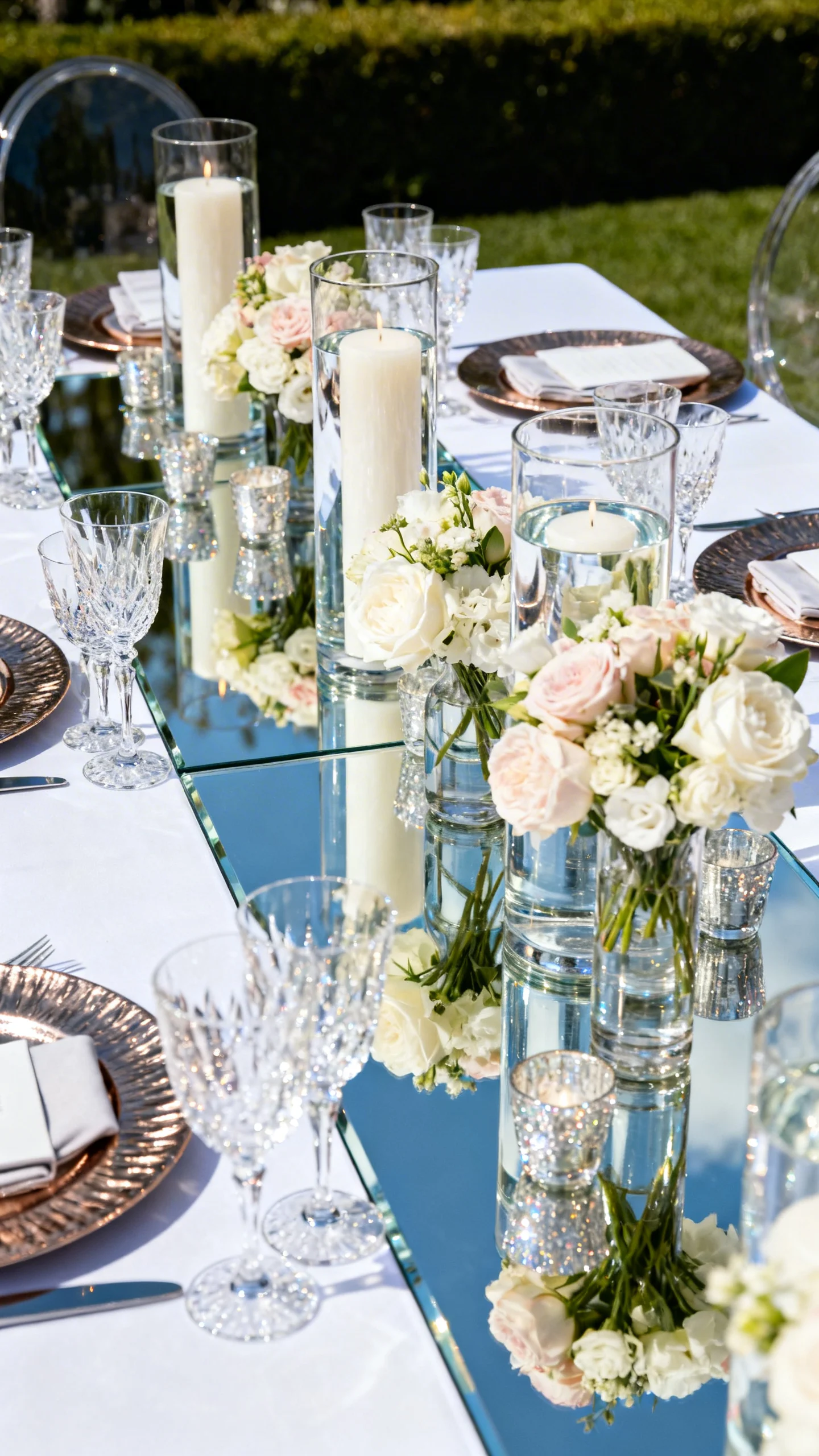 Place arrangements and candles on mirrored or clear acrylic runners to amplify sparkle and create that luxury reflection effect. Mirrors make even simple blooms look fuller because they double the visual impact. Keep stems clean and waterlines polished if you’re using glass vessels. This idea pairs beautifully with crystal, metallic chargers, and modern calligraphy place cards.