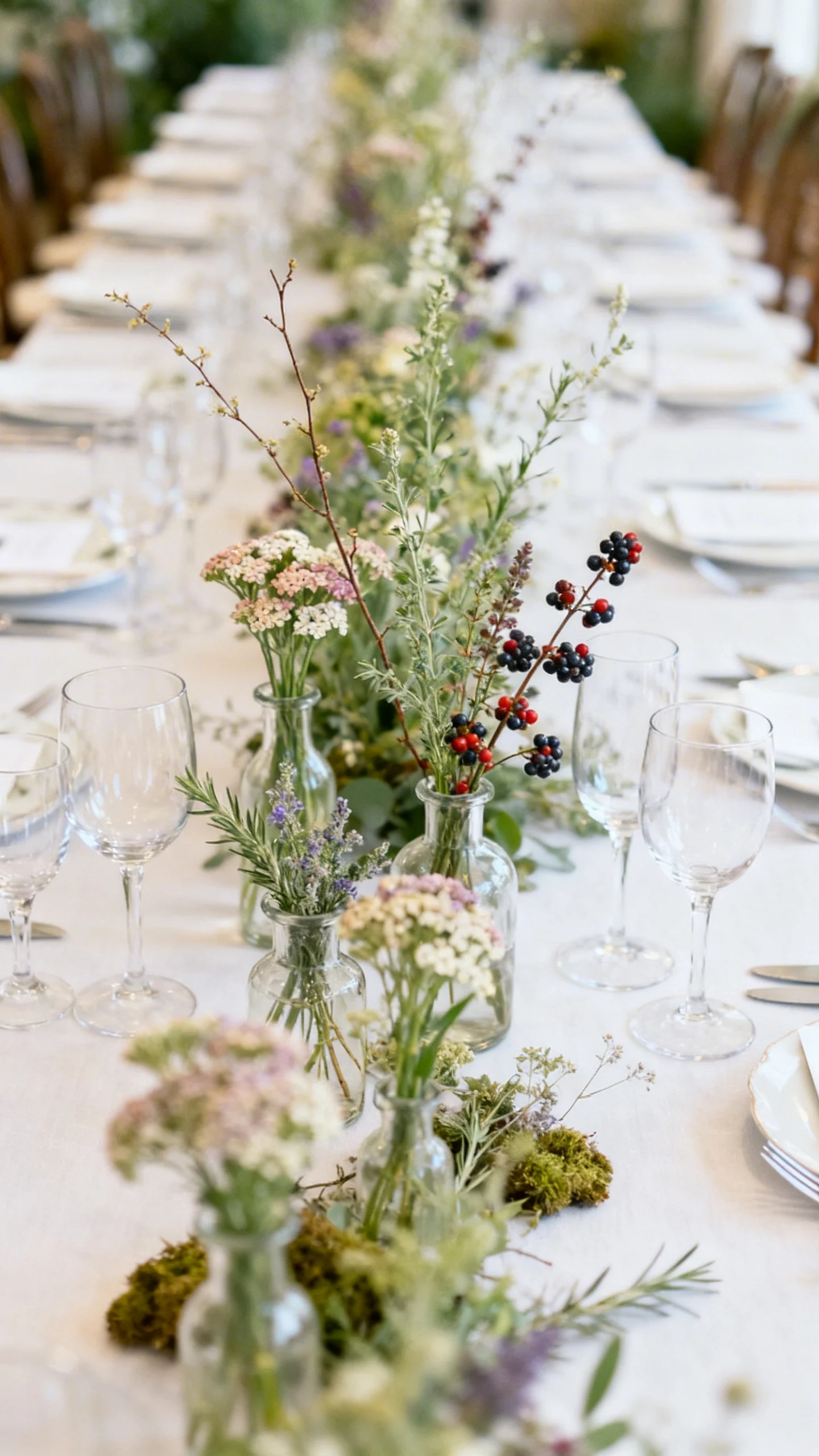 Create the look of a flower meadow growing right across your tables by using clusters of bud vases mixed with low foam-free arrangements. Vary heights slightly so it feels organic, not uniform. Tuck in unexpected elements like flowering herbs, berries, or delicate branching for a “just gathered” richness. This approach is also flexible for long tables, rounds, and even serpentine layouts.