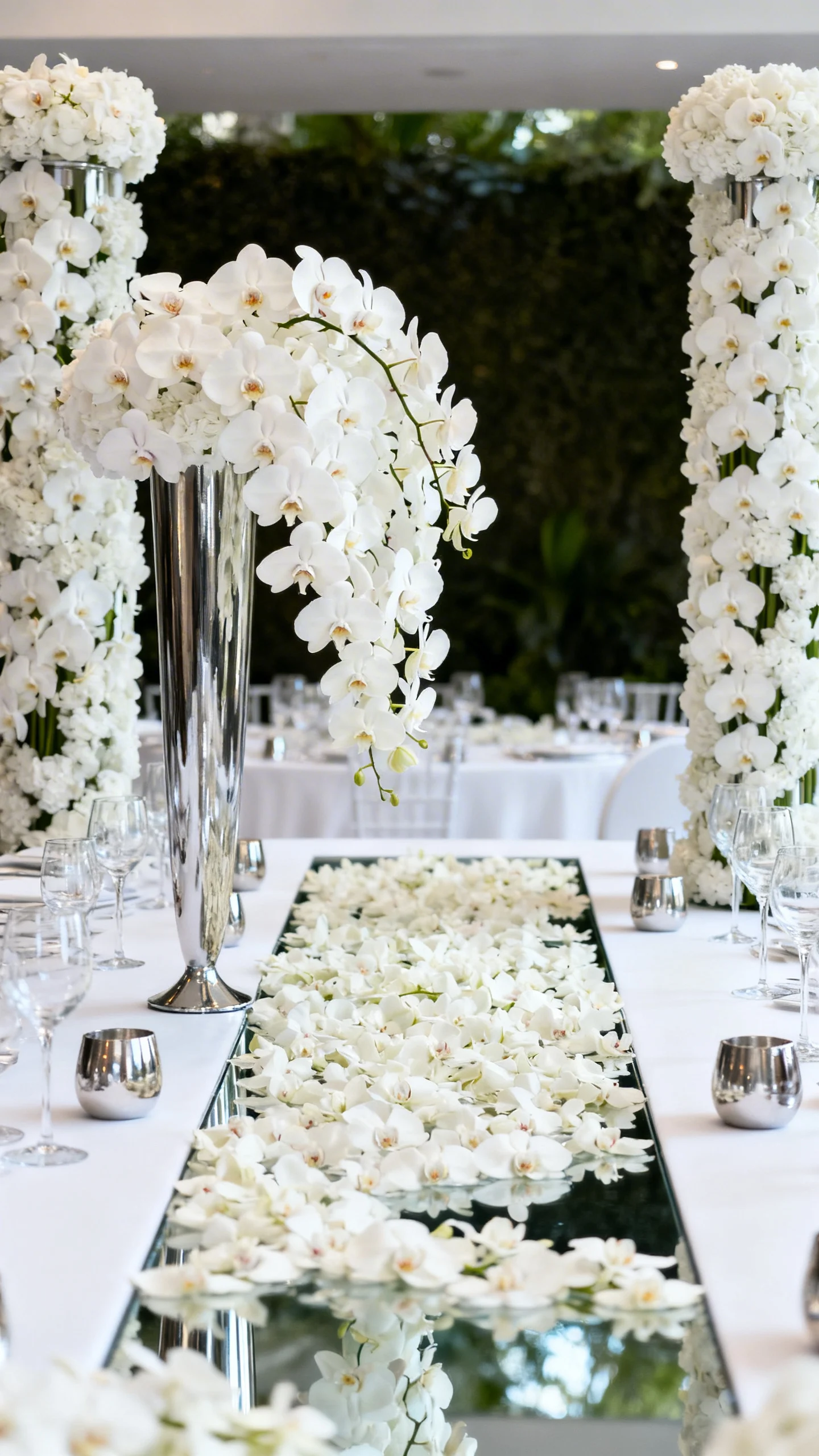 Orchids instantly read as luxury, especially when used generously. Try phalaenopsis cascades spilling from centerpieces, orchid columns framing the table ends, or a “pool” of blooms across a mirrored runner. Keep the color story minimal—white-on-white, blush, or a single bold shade—so the texture feels elevated. Pair with sleek glass or polished metal to lean modern and high-end.