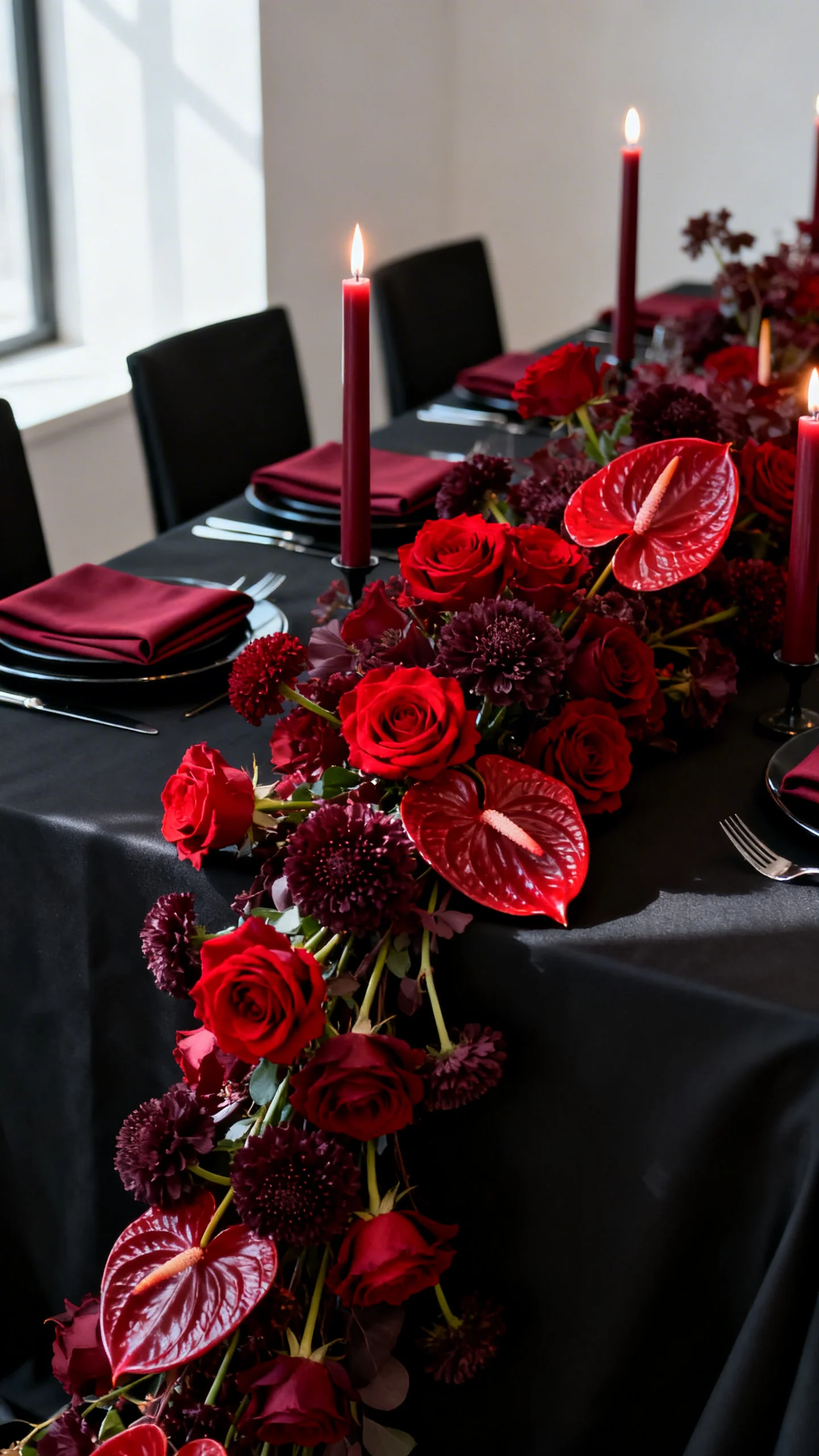 A single-color floral story can feel incredibly high-fashion when it’s done with abundance and variety of shapes. Build the look by mixing different flowers in the same tone, like red garden roses with red anthurium and burgundy scabiosa. Match linens, napkins, and taper candles to the same family for a seamless effect. This is especially striking in candlelit rooms and black-tie spaces.