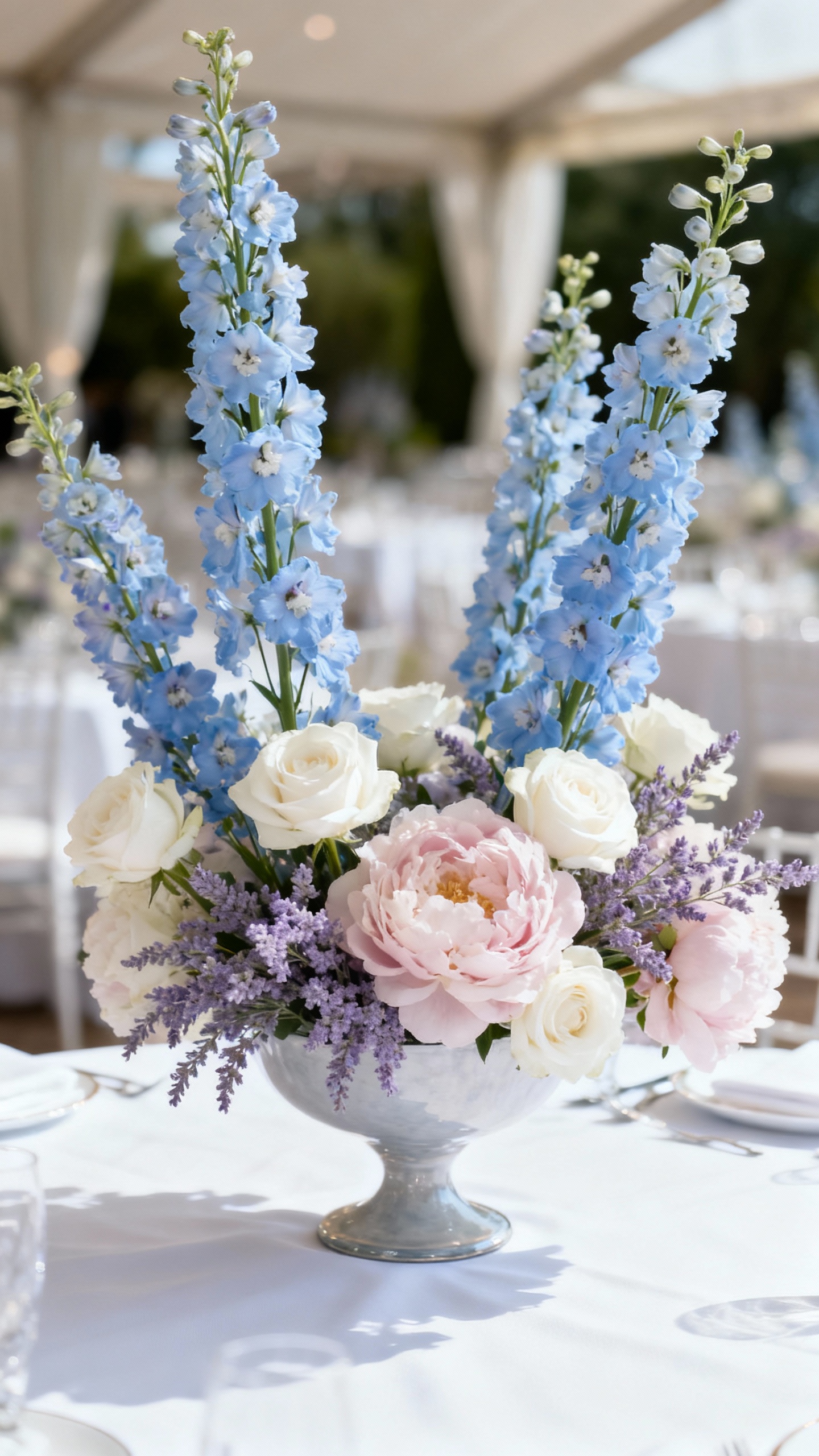 If you want pastels that still “show up” in photos, delphinium is your girl. Powder blue reads clearly in wide venue shots, adds vertical lines to arrangements, and looks amazing against white linens and greenery. Use it for ceremony installs, tall centerpieces, or to frame your sweetheart table—anywhere you want height without heaviness. Bonus: it photographs beautifully in cloudy weather and indoor spaces where lighter colors can sometimes fade out.