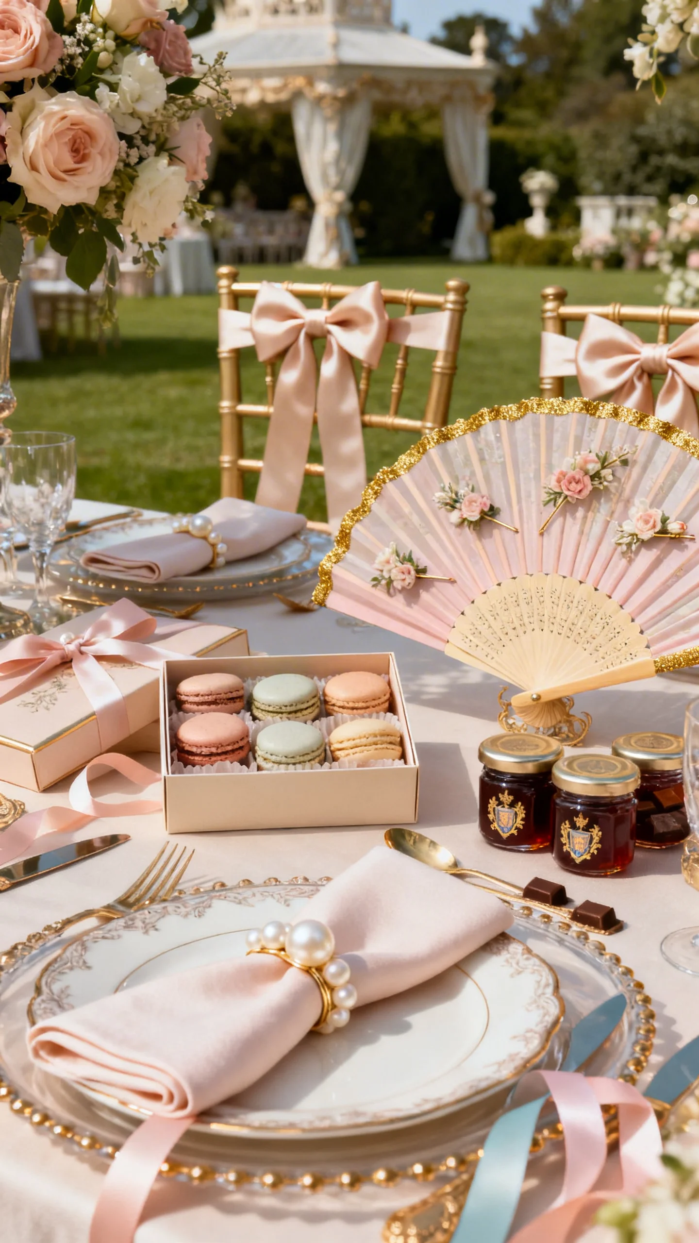 Details are where Rococo becomes unforgettable: pearl accents on napkin rings, bows on chair backs, and delicate floral hair pins. Offer guests pretty hand fans for outdoor ceremonies, especially in pastel shades with gold trim. For favors, go small and luxe—macarons in elegant boxes, mini jam jars with crests, or custom chocolates. Tie everything together with ribbon colors that match your palette.