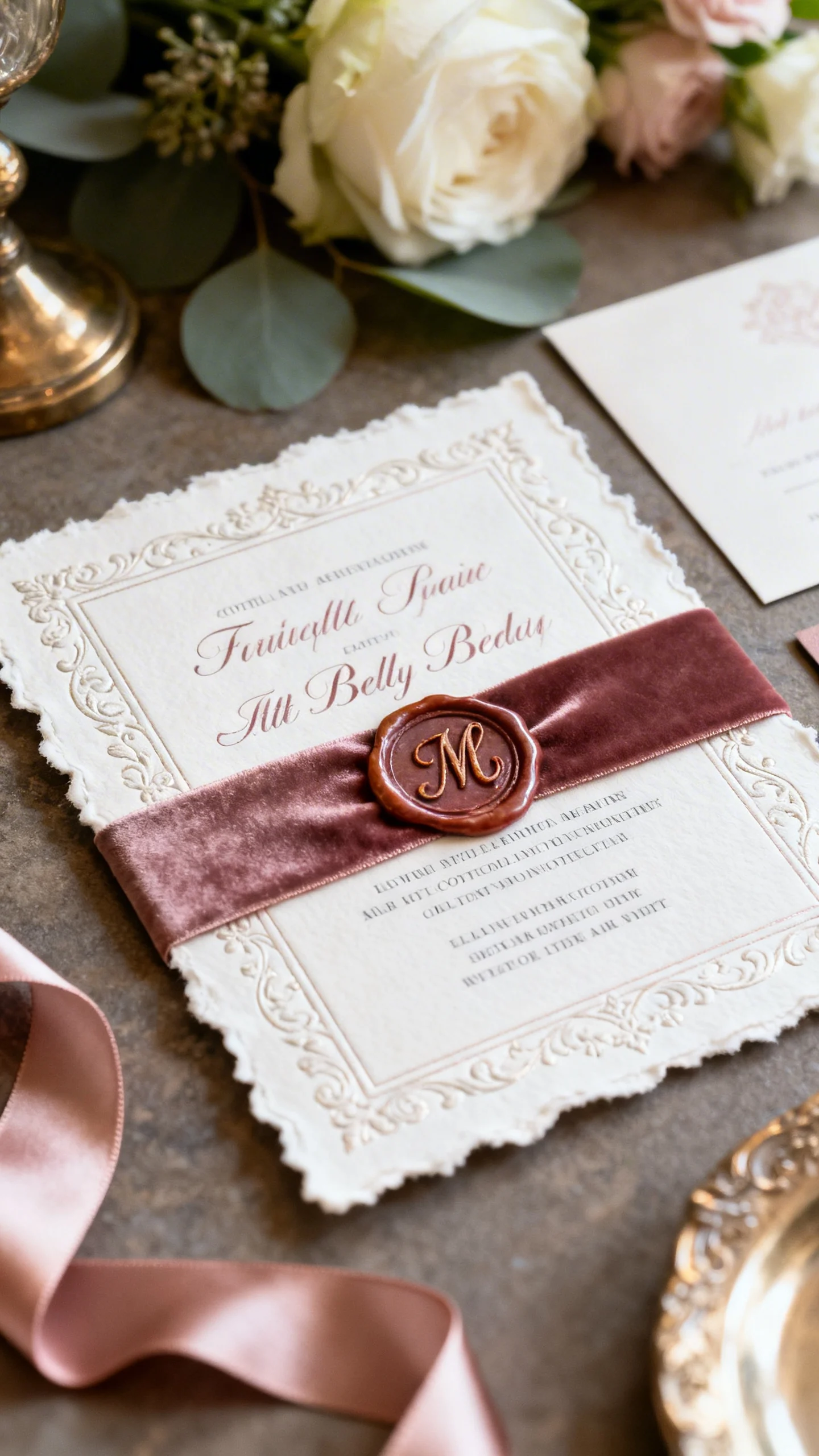 2) Ornate invitations with wax seals and ribbon