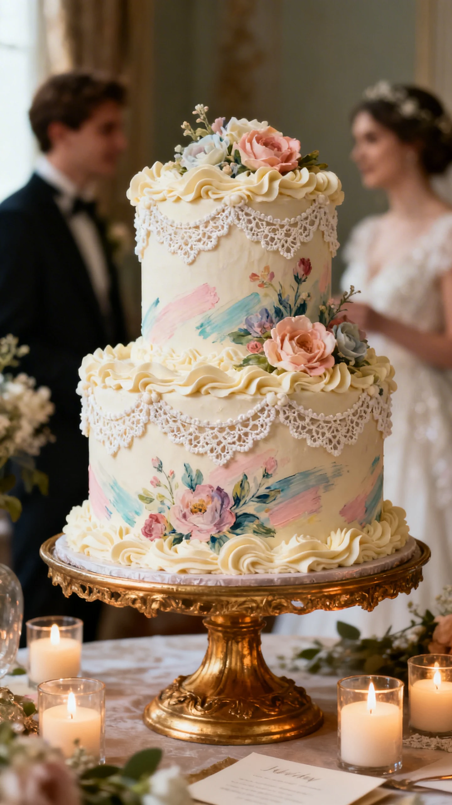A Rococo cake should feel like a miniature work of art—soft, ornate, and a little theatrical. Choose buttercream ruffles, sugar flowers, and delicate piping that mimics lace and scrollwork. Hand-painted florals or pastel brushstrokes make it look straight out of an 18th-century portrait. Display it on a gilded stand with candles around the base for a true centerpiece moment.