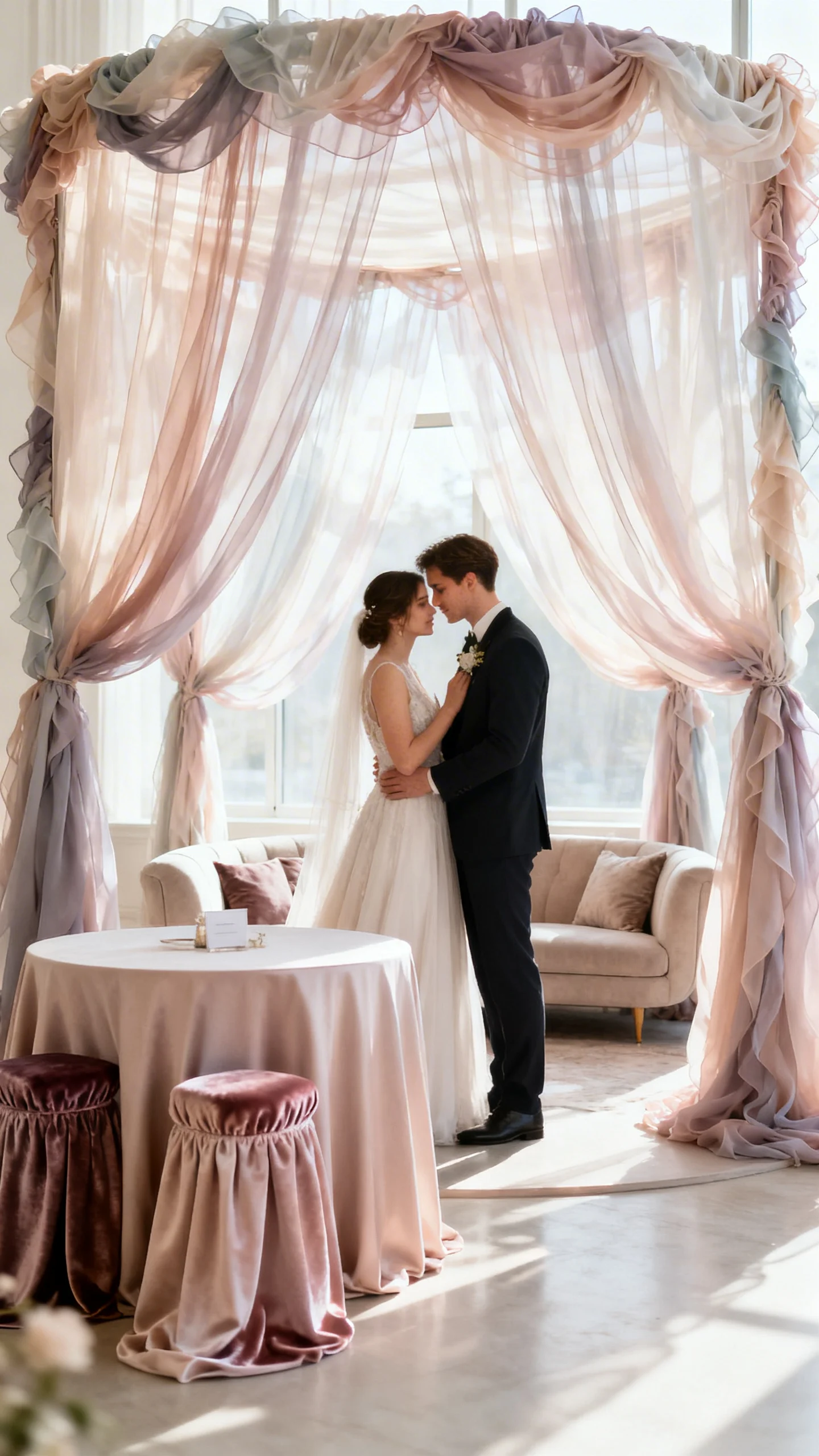 Rococo loves softness—think swags, gathered fabric, and dreamy layers that look like they were styled by a royal decorator. Use draping behind the ceremony, at the head table, or as a canopy effect over your lounge. Choose light, flowing fabrics (sheer, chiffon) and accent with heavier textures (velvet, satin) in small doses. The goal is romance with movement, not a heavy stage curtain.