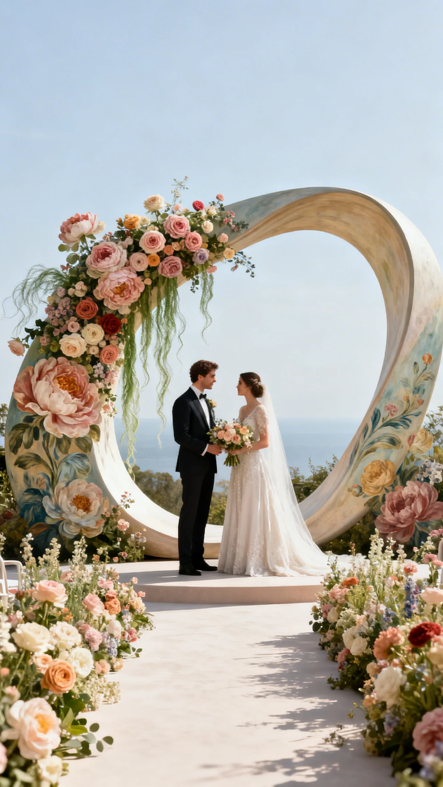 Swap a basic rectangle arch for something more romantic: an oval, asymmetrical curve, or sculptural “swoop” shape. Dress it with garden roses, peonies, ranunculus, and airy trailing greens for movement. Add a few oversized blooms to create that painted, portrait-like look Rococo is known for. Place matching floral meadows at the aisle ends to frame your photos beautifully.