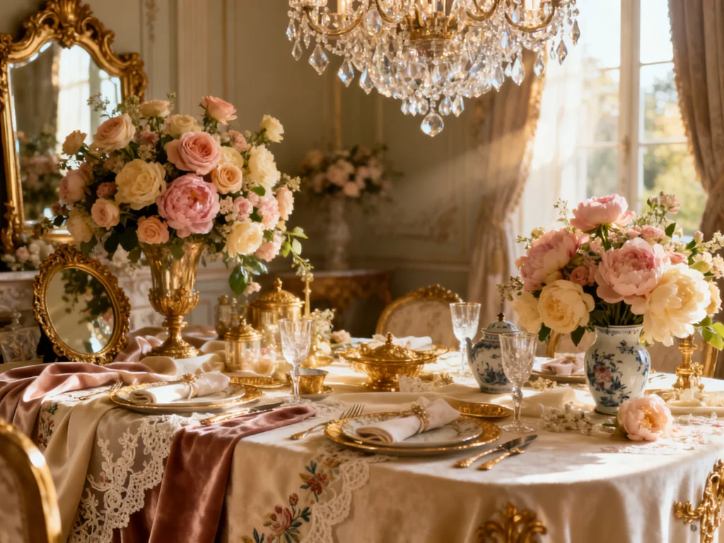Start with a Rococo color story: blush, powder blue, lavender, pistachio, and creamy ivory. Layer in gold (or antique brass) through frames, candlesticks, and chargers for instant royal energy. Keep one “anchor neutral” like warm white linens so the pastels stay elegant, not sugary. If you want a modern edge, add small hits of black in menus or ribbon.