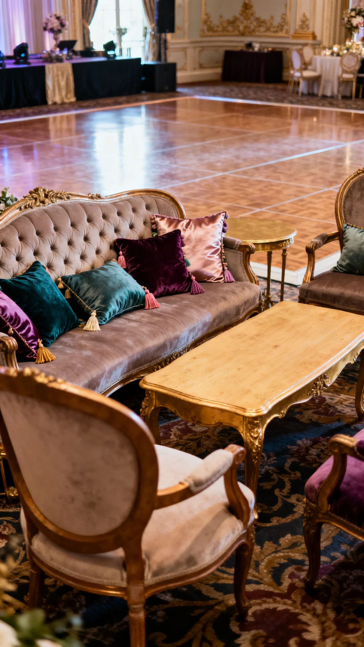 Carve out a seating vignette that looks like it belongs in a palace salon. Look for tufted settees, curved-backed chairs, and vintage-style coffee tables in gold or light wood. Add pillows in silk, satin, or velvet with tassels for texture and a hint of playfulness. Place the lounge near the dance floor so it feels intentional, not like extra furniture.