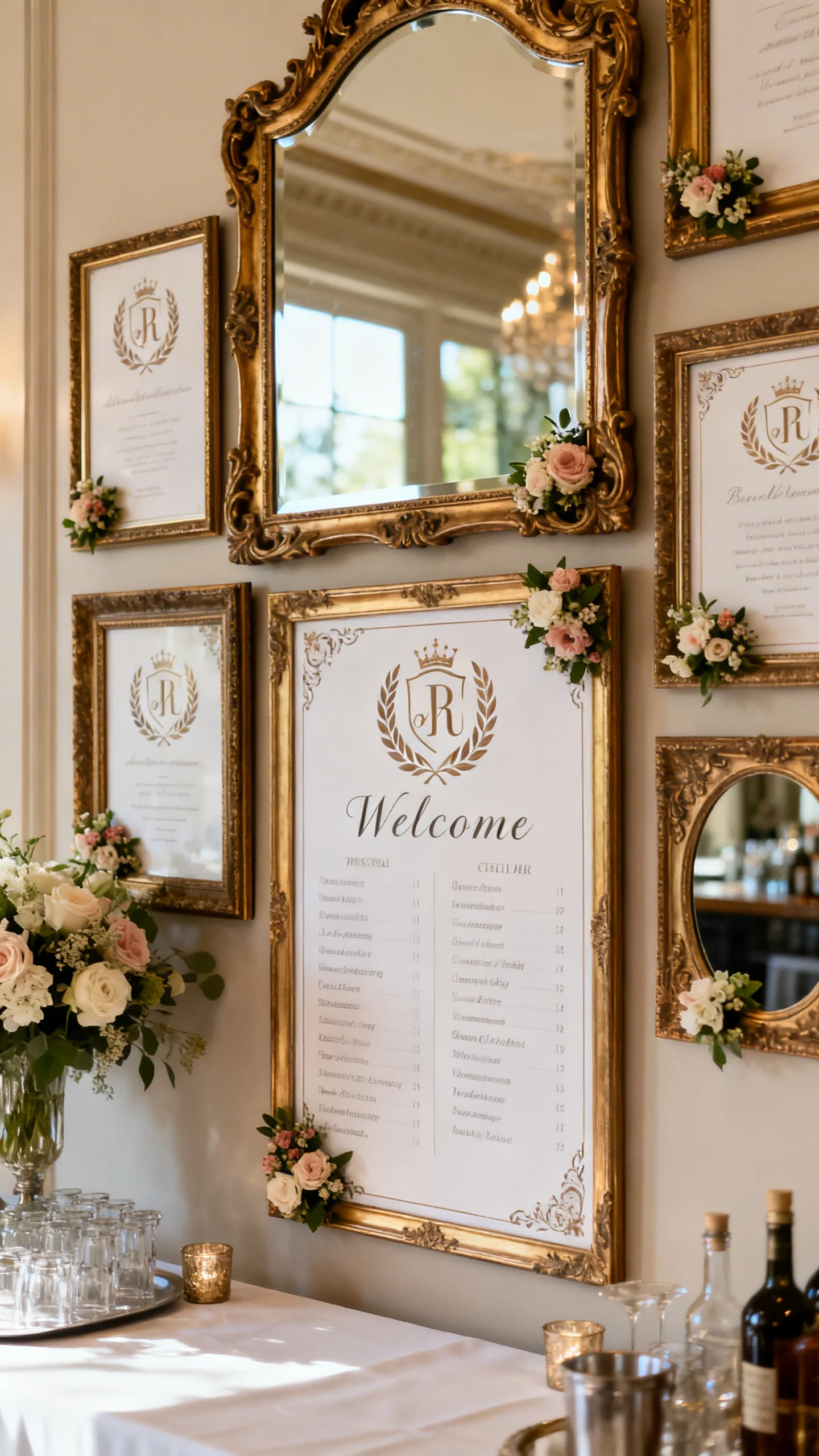 Use ornate frames and mirrors for welcome signs, seating charts, and bar menus to instantly set the theme. Crest-style monograms, laurel motifs, and decorative corners keep everything cohesive. Mix frame sizes for a gallery-wall effect, but keep the typography consistent so it doesn’t feel busy. For an elevated touch, add small floral clusters to the corners of key signs.