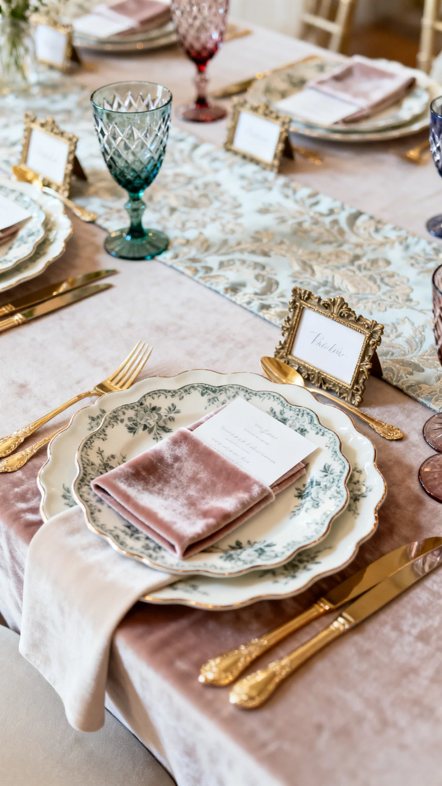 Bring the “court dining” fantasy to life with patterned china, scalloped plates, and gold flatware. Layer linens: a soft base cloth topped with a runner in velvet, brocade, or subtle jacquard. Choose glassware with cut or colored detail to add richness without clutter. Finish with name cards in tiny frames or on ornate holders for a charming, curated feel.
