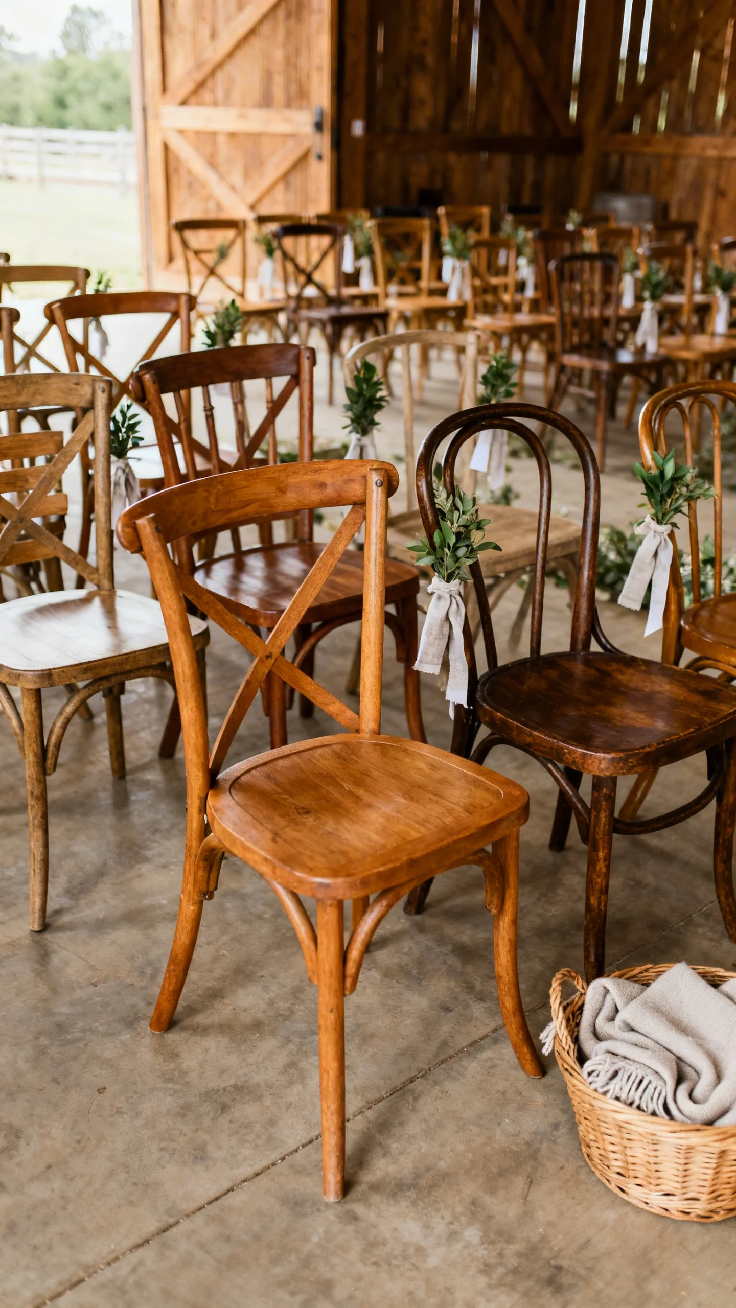 Mixed wood chairs can look charming and curated when the tones are in the same warm family. If rentals aren’t in the budget, unify mismatched seating with simple chair markers on aisle seats only. Add comfort with a small basket of neutral blankets for cool weather ceremonies. Keep extras tucked to the side so the ceremony space still feels clean and photo-ready.