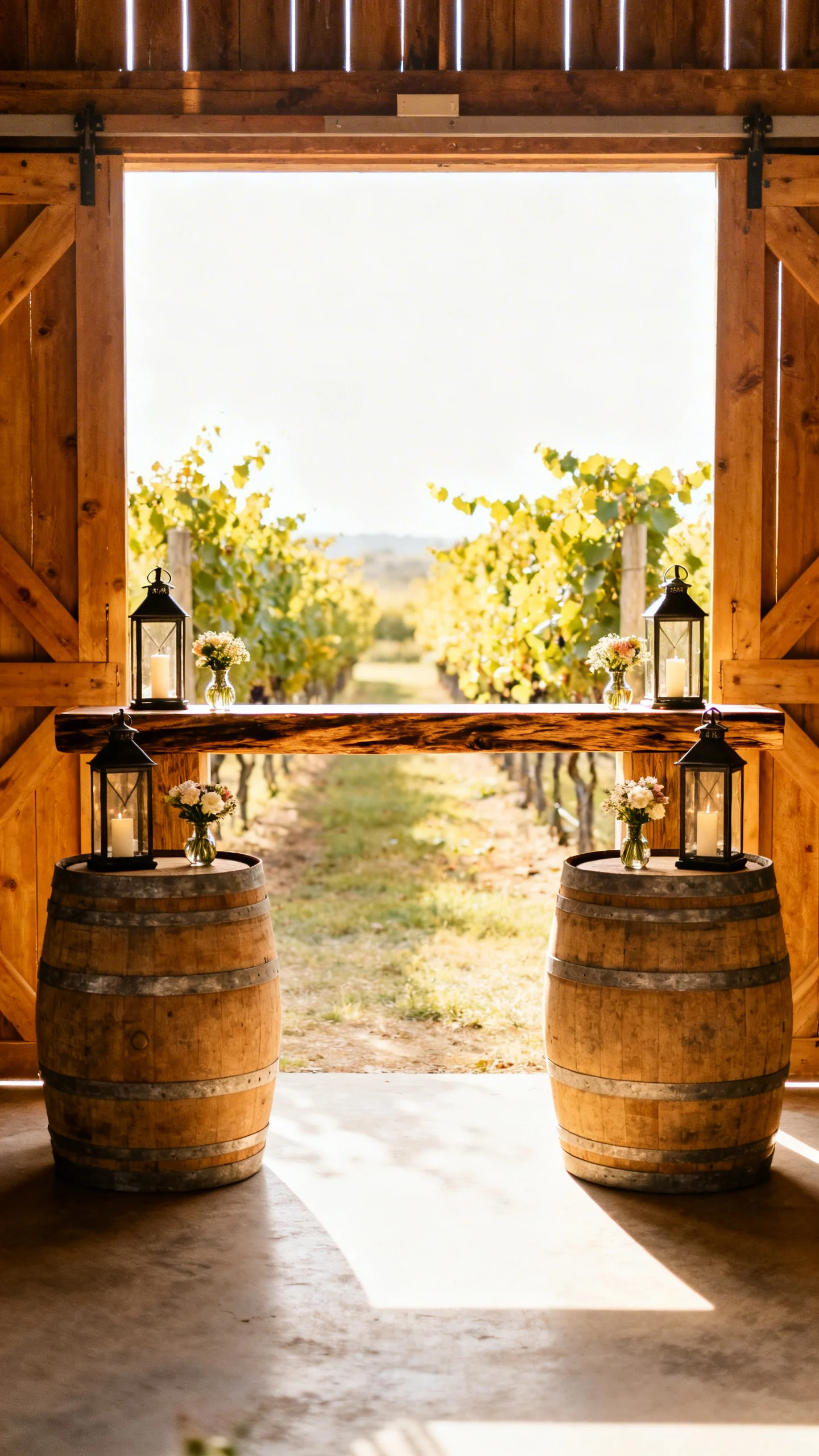 For a barn or vineyard setting, flank your ceremony spot with wine barrels and a wide plank “mantel” effect behind you. Layer in lanterns, small floral compotes, or bud vases to add height without blocking views. This setup feels grounded and sturdy, which is perfect for windy outdoor ceremonies. It also doubles as a natural frame for portraits right after the vows.