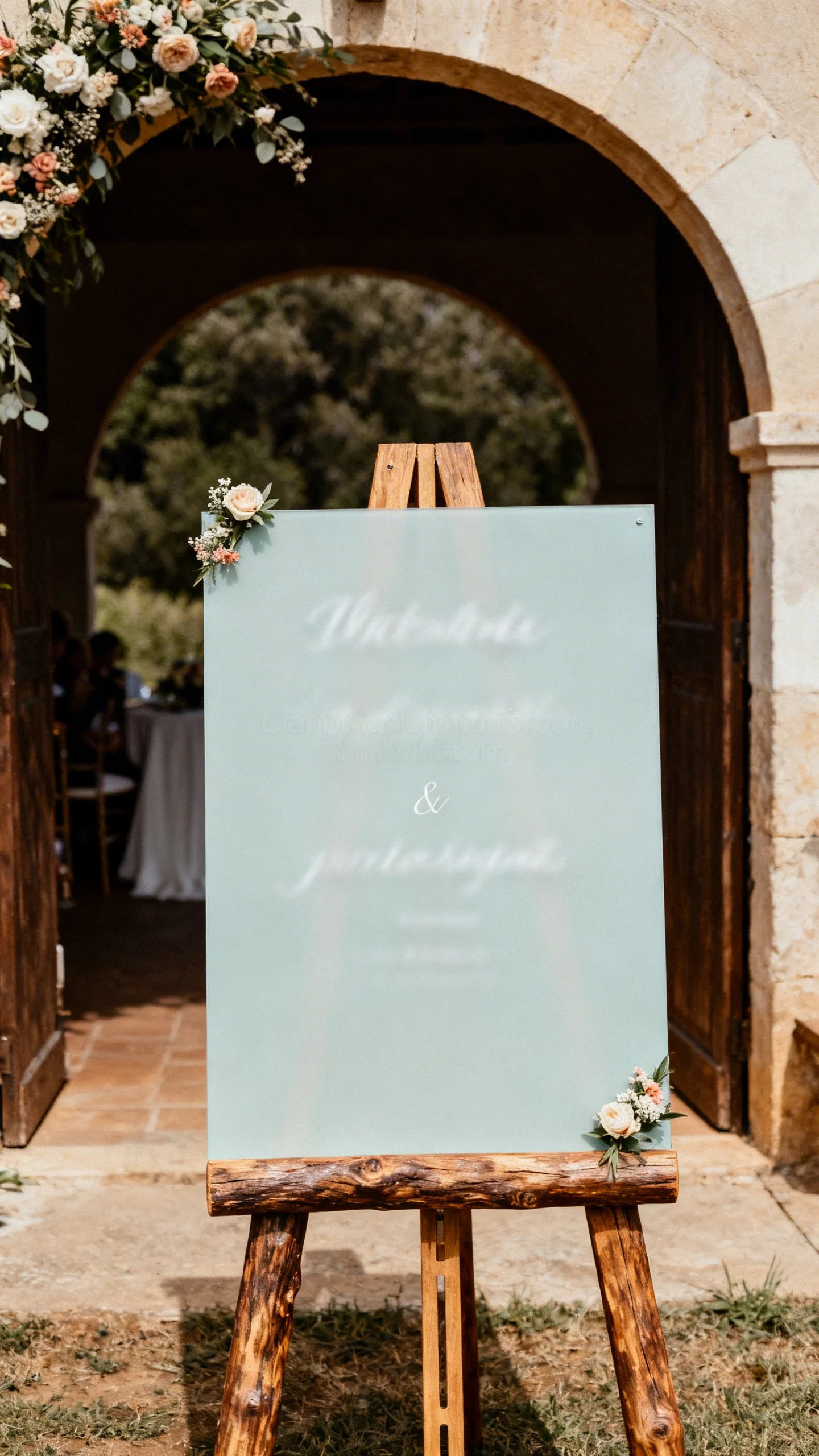 A rustic welcome sign sets the tone before guests even find their seats. Frame a painted board or acrylic panel with a timber easel or a chunky wood stand for that barn-chic vibe. Keep the text minimal: names, date, and a warm greeting is enough. Add a small floral accent that matches the ceremony arch so everything feels cohesive.