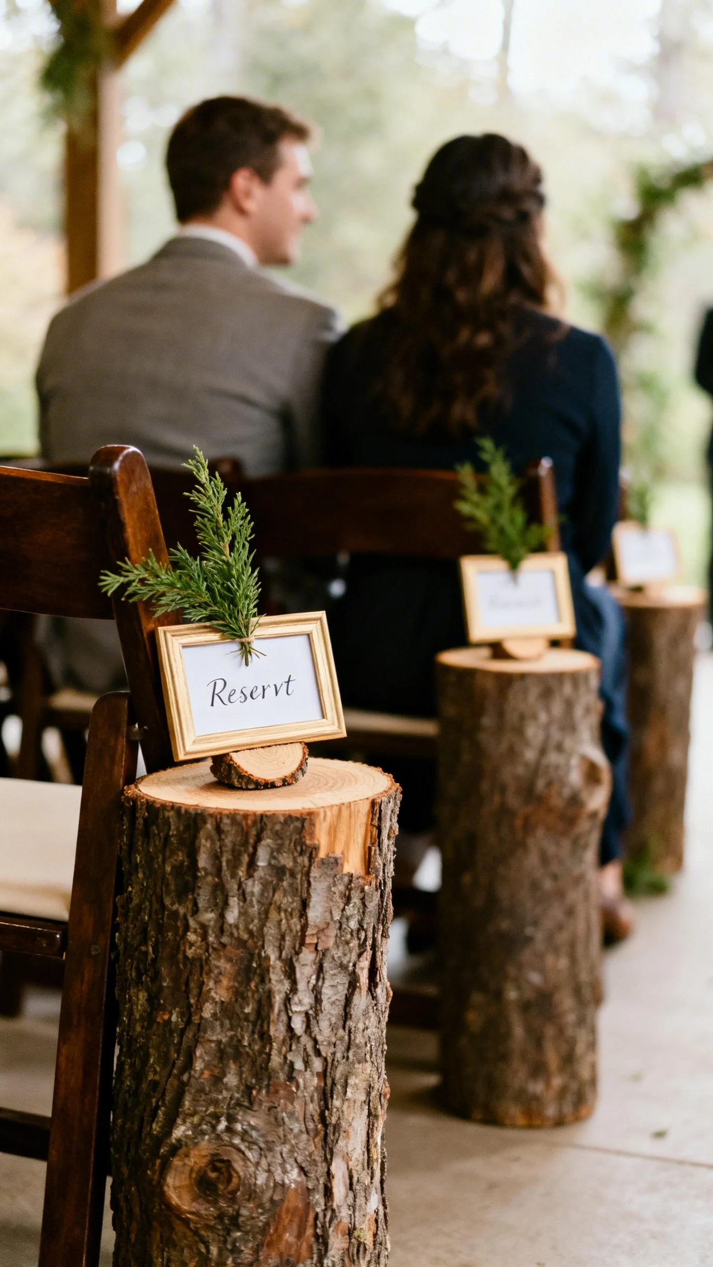 Reserved signs feel especially meaningful for parents, grandparents, and wedding party seating. Use small wood slices, folded tent cards on kraft paper, or mini framed signs for a rustic look. Keep wording consistent and gentle—“Reserved for Family” or specific names works well. Position reserved seats at the front corners so they’re honored without blocking the processional.