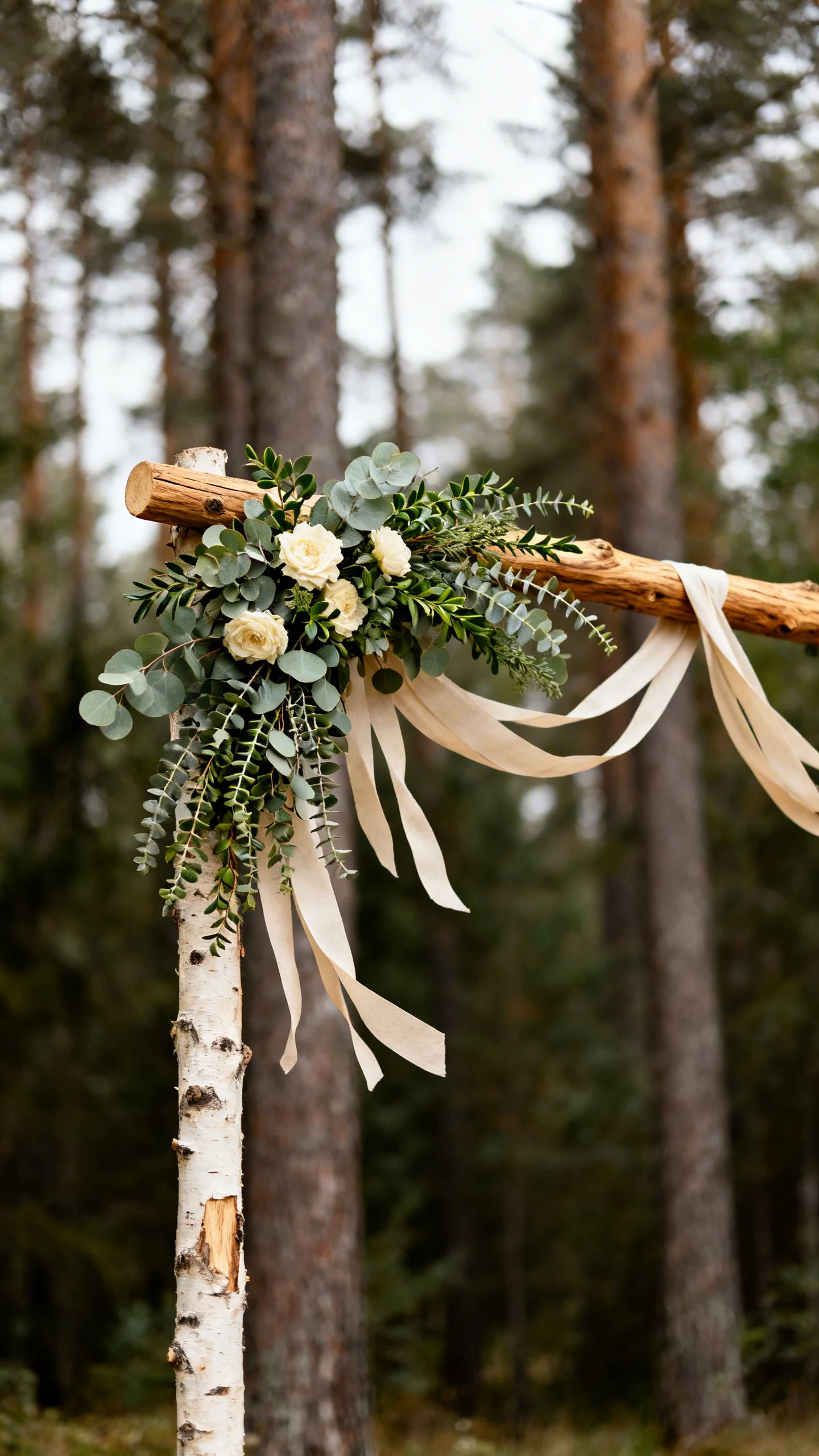 Start with a simple wooden arch—think raw oak, birch, or a lightly stained frame—and let greenery do the heavy lifting. Add asymmetrical bundles of eucalyptus, smilax, or ruscus for that effortless rustic feel. For a softer look, weave in a few creamy blooms and neutral ribbon tails. Place the arch slightly forward from the backdrop so photos feel layered and intentional.