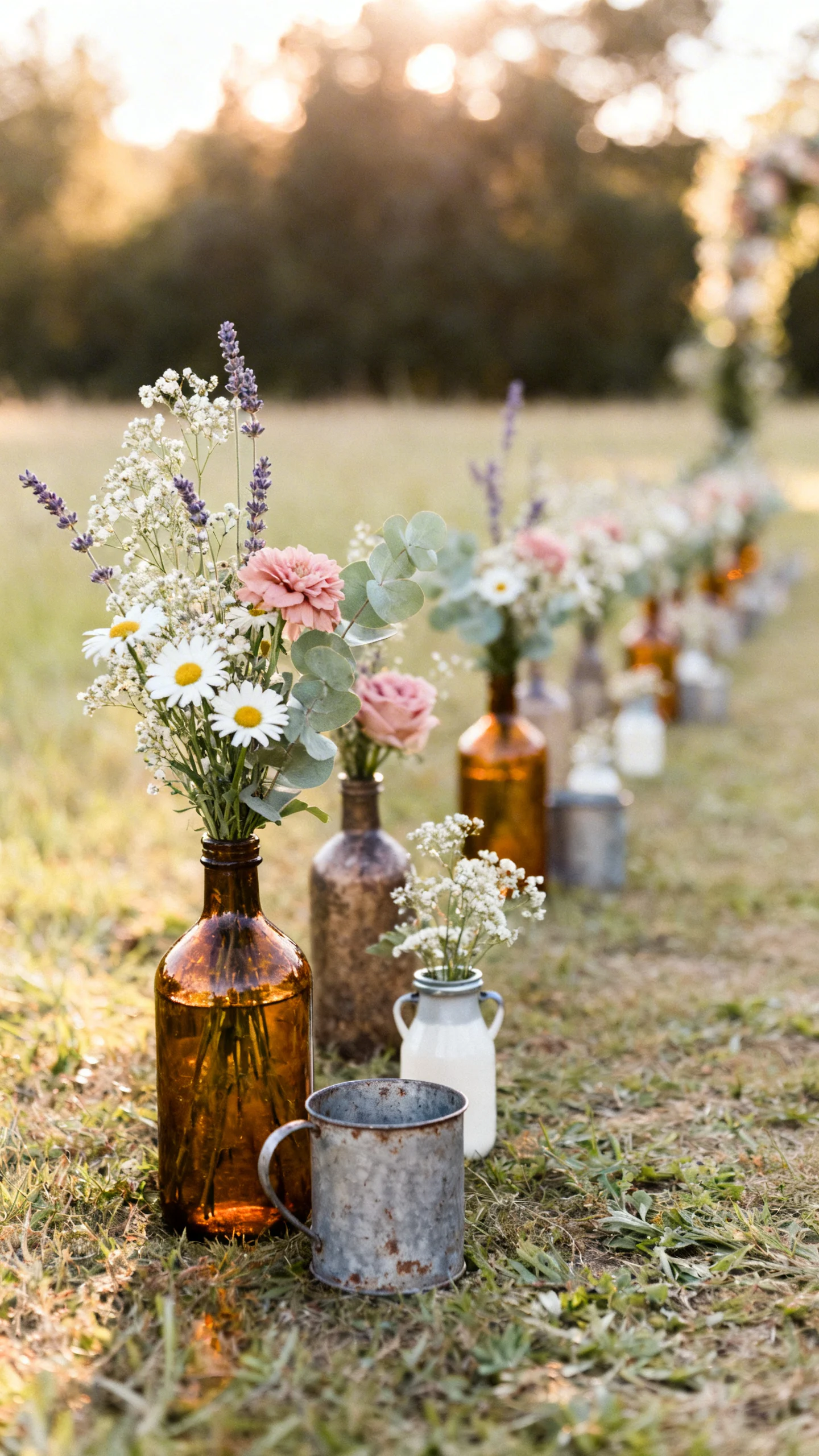 Line the aisle with small arrangements in mismatched vessels like amber bottles, tin cups, and mini milk cans. Keep the florals loose and meadow-inspired so it reads rustic, not formal ballroom. Stagger sizes and heights so the aisle feels designed from every angle. To keep it neat, choose a limited color palette and repeat two or three flower types throughout.