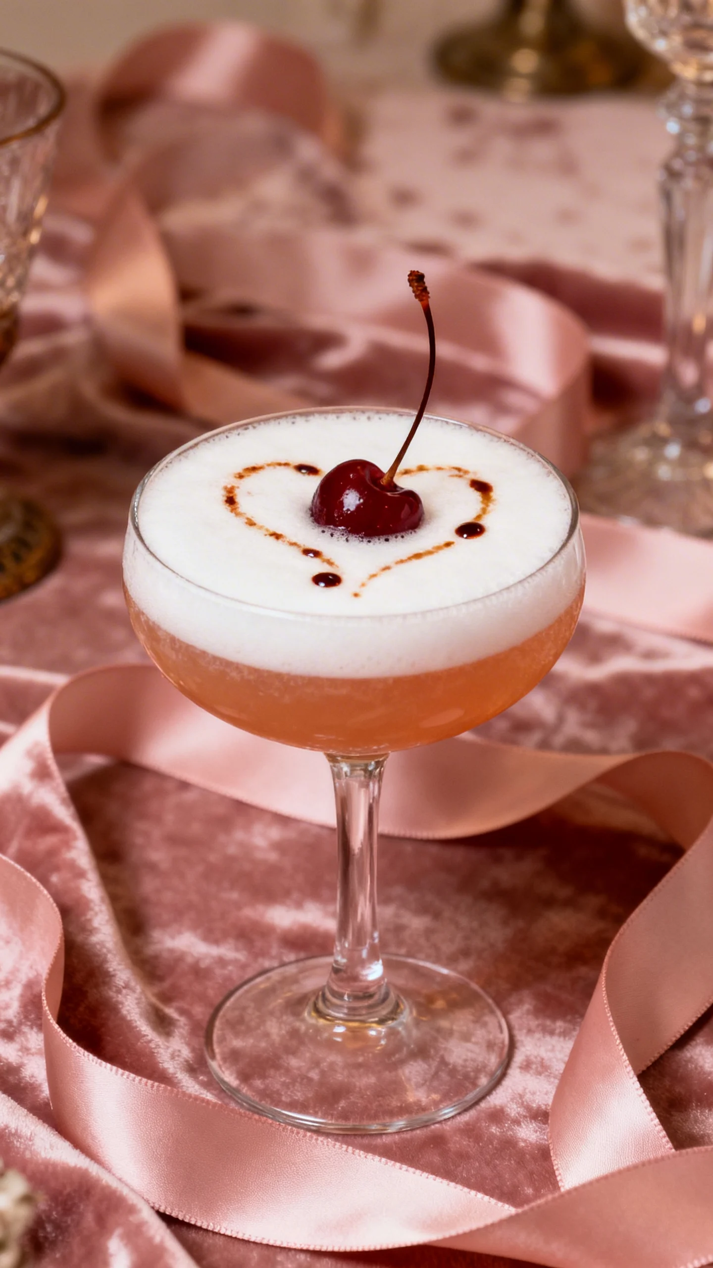 Lean into old-Hollywood romance with amaretto, lemon, and a cherry-forward finish. An egg white (or aquafaba) foam layer makes it feel luxe and gives you that dreamy, vintage look in photos. Top with a single brandied cherry and a few drops of bitters in a heart or swirl pattern. Serve in coupes to echo antique glassware and soft, nostalgic styling.