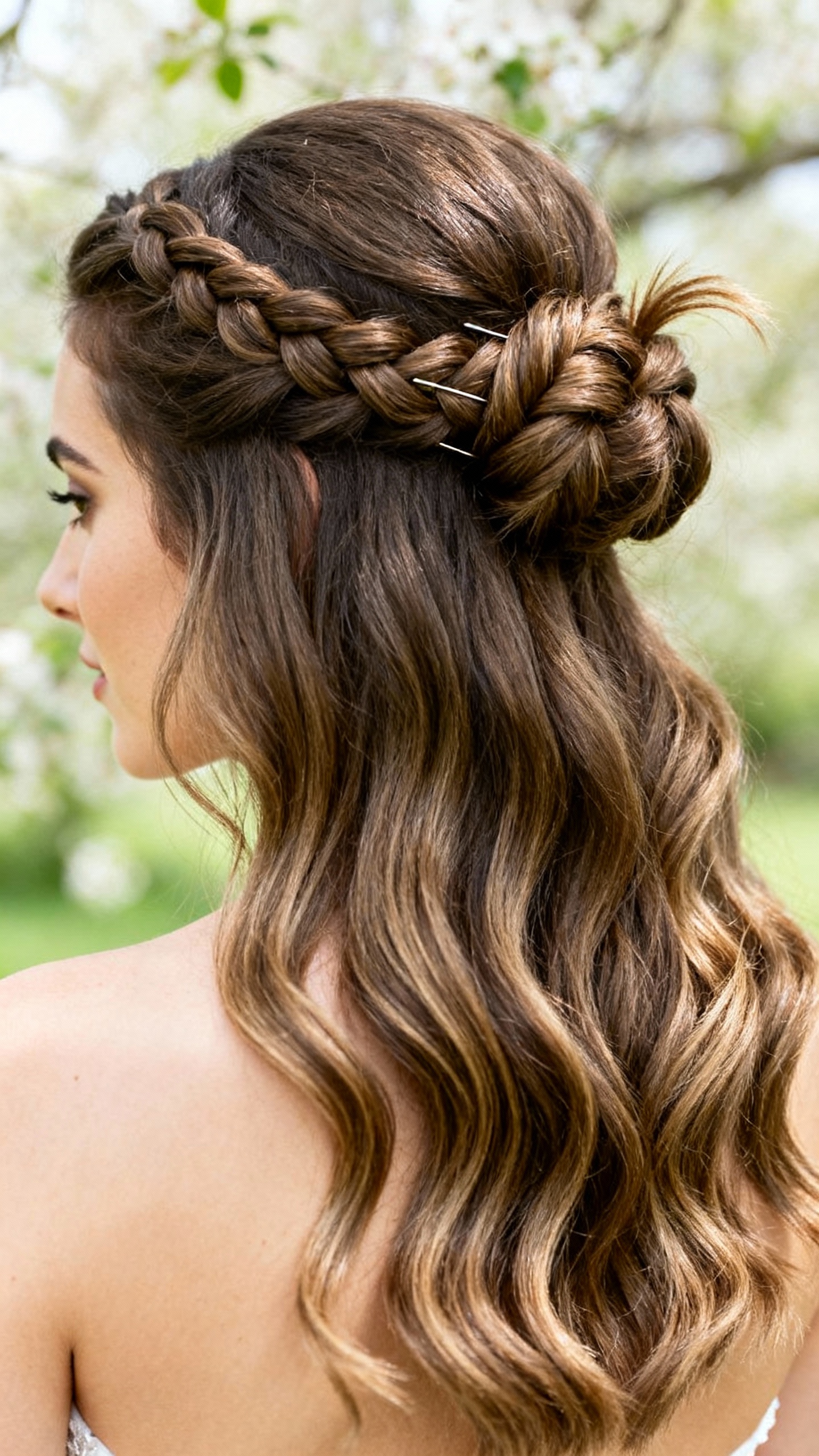 A half-up style is perfect if you want hair down but don’t want it in your face all ceremony long. It’s super flattering on medium to long hair and gives a gentle lift on the crown that looks amazing in photos (hello, profile shots). The vibe is garden-party bride—sweet, elevated, and not overly formal. Practical tip: for April humidity, have your stylist pin the twists with crossed bobby pins and finish with a flexible hold spray so it moves without collapsing.