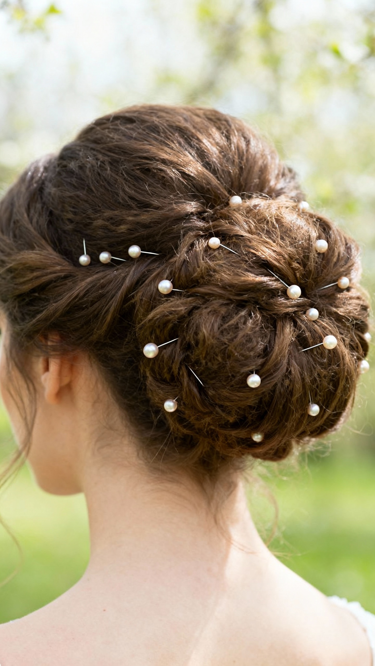 4) Textured Chignon with Pearl Pins (Not a Full Pearl Headband)