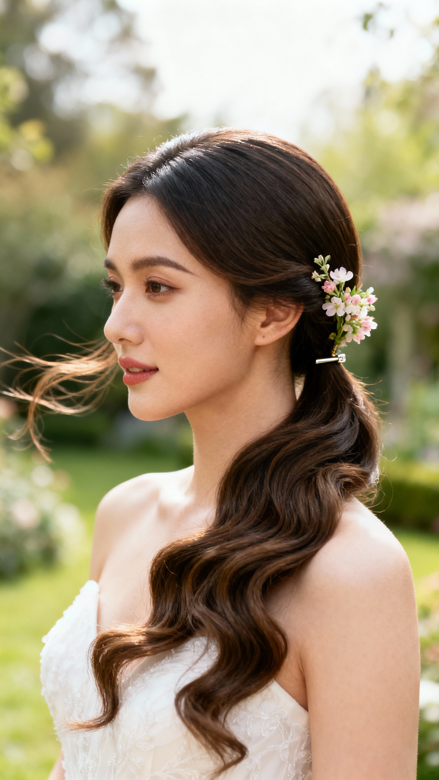 Side-swept waves feel effortlessly romantic for April, especially for outdoor ceremonies where the breeze can actually help the movement look dreamy. This style flatters round and square face shapes because it creates asymmetry and softness along the cheekbones. The key is keeping it bridal, not prom: use a low floral clip (fresh or faux) near the ear instead of a sparkly comb across the crown. Practical tip: ask for a “brushed-out” wave with structure—set with pins while it cools—so it lasts longer than a quick curling-iron wave.