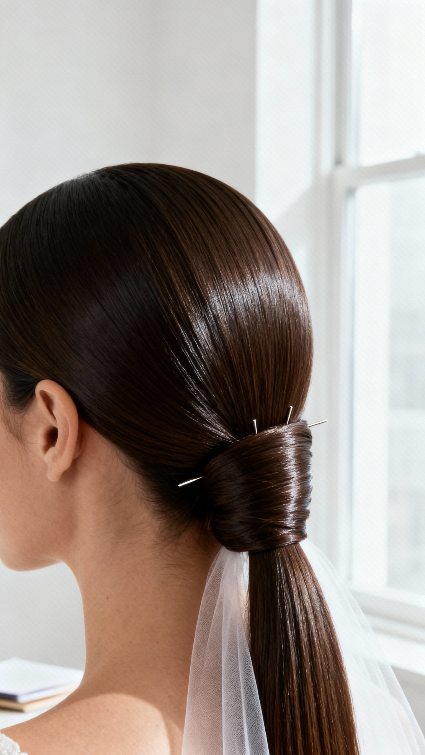 If you love clean lines and modern minimalism, a sleek low pony feels chic without giving pageant energy. It flatters longer necks and looks especially stunning with square or off-the-shoulder necklines, plus it keeps hair controlled if it’s breezy outside. The wrapped base hides elastics and instantly makes it “bridal” in a cool way. Practical tip: if you’re wearing a veil, place it above the ponytail base and anchor it with a small teasing cushion so the comb doesn’t slide on sleek hair.