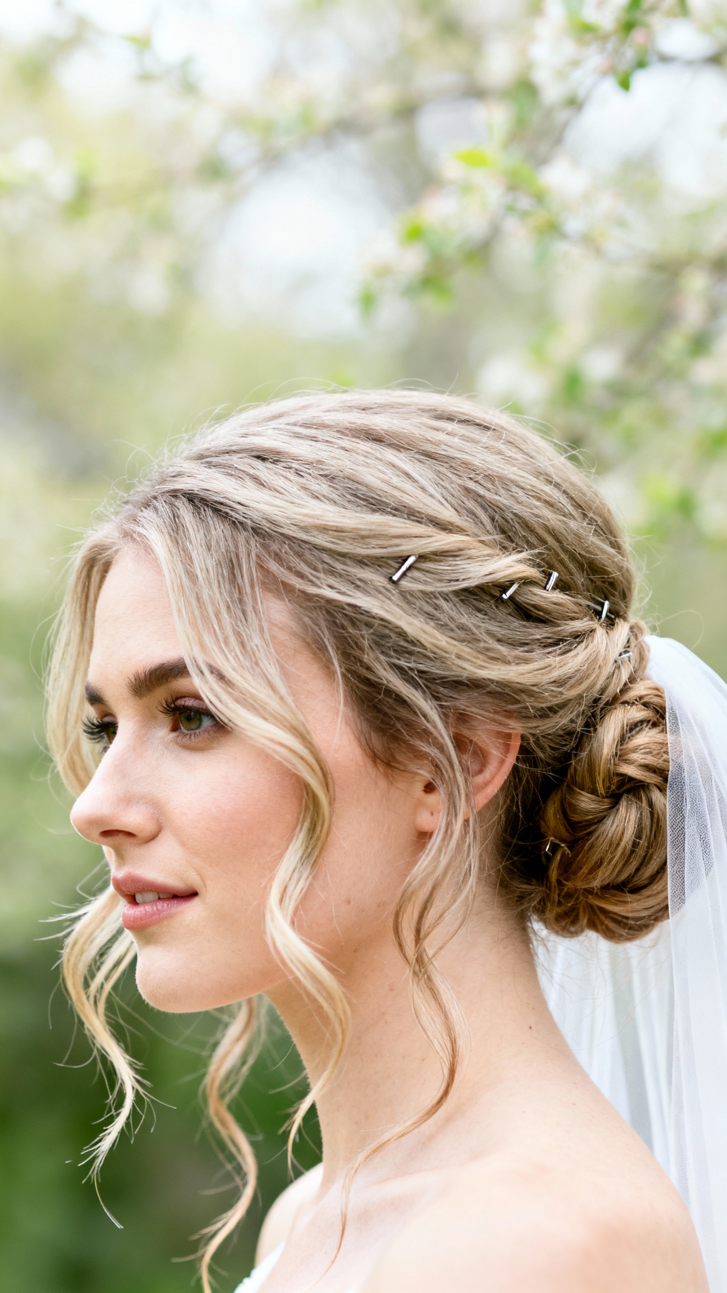 This is the definition of soft spring bridal—polished, but not tight or severe. It flatters most face shapes (especially oval, heart, and round) because the front pieces add length and balance. Keep the bun low at the nape for a romantic vibe and easy veil placement right above the bun. Practical tip: ask for light texture prep (dry texture spray or a little wave) so the “loose” pieces don’t fall flat in hour one.