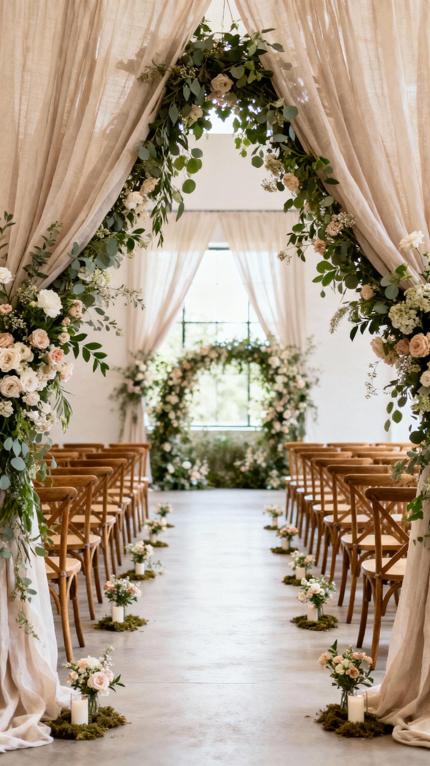 Your ceremony spot is the most-photographed “room” of the day, so give it a focal point. Think layered draping, a floral-meets-greenery installation, or even a styled bookshelf wall if you’re indoors. Keep it polished by repeating your color palette and adding one intentional texture (sheer fabric, velvet ribbon, or greenery). If you’re DIY-ing, build it to be freestanding so you’re not damaging walls.