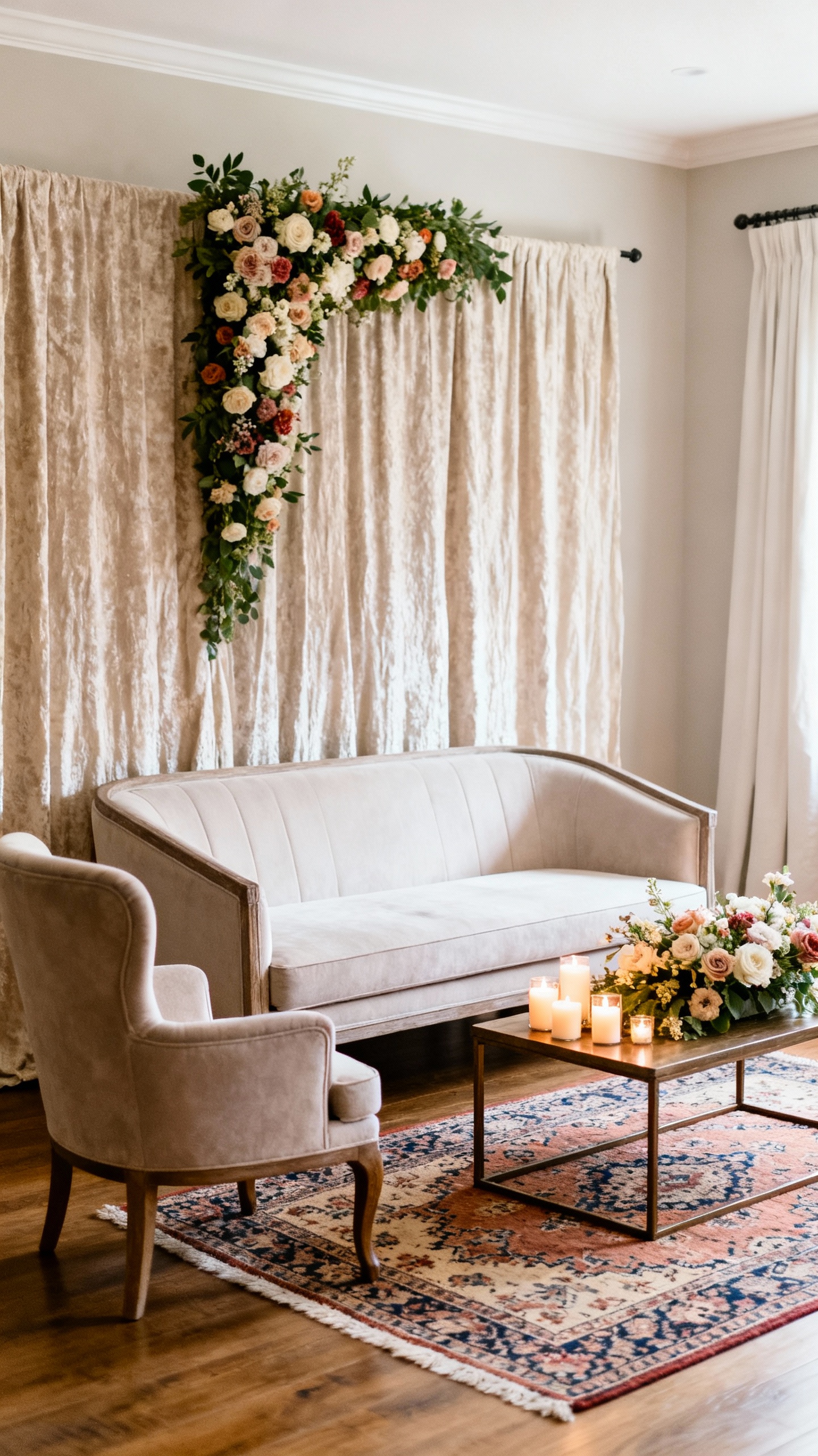 You don’t need a massive photo booth setup—just a cute corner guests naturally want to hang out in and snap pics. Pull together a loveseat or two chairs, a small rug, a coffee table, and one standout element behind it (draping, greenery, or a simple backdrop panel). Add one or two styled props like a vintage mirror sign or a basket of cozy throws for later in the night. This also gives your space a “wedding layout,” which helps an at-home event feel thoughtfully designed.