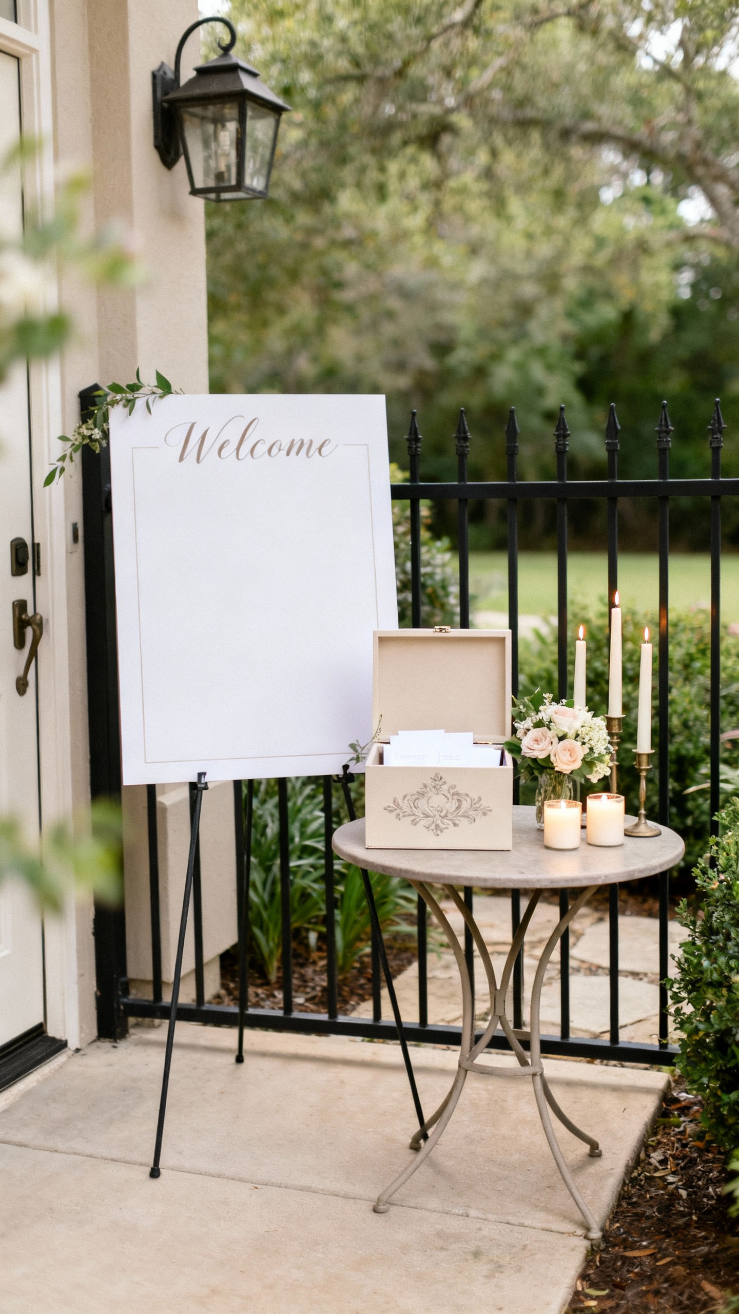 At-home weddings feel instantly more official when guests arrive to a curated entry moment. Create a small vignette with a welcome sign, a card box, and a tiny floral arrangement or candle trio so it feels intentional, not like a last-minute table drop. Use the same fonts and colors across signs (welcome, seating, bar menu) to make it look like a set. If you’re printing at home, put everything in matching frames for an easy, elevated finish.
