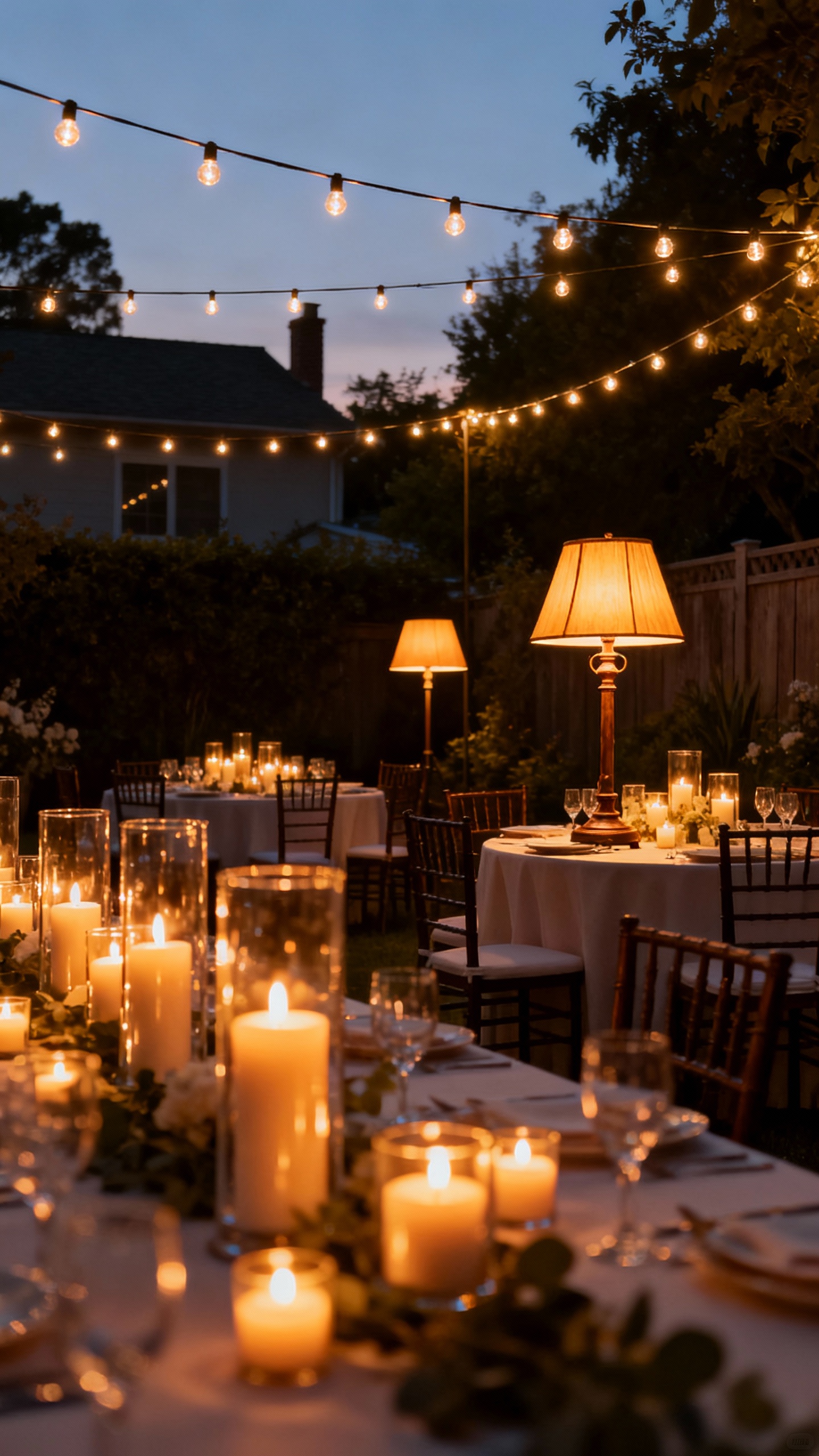 Lighting is the fastest way to make a backyard or living room feel like a venue. Mix overhead bistro lights with clusters of candles on tables, then add a few warm floor or table lamps to soften corners and create that glowy “golden hour” look all night. Stick to warm bulbs (around 2700K) so photos don’t turn harsh or blue. Bonus: lighting also helps define zones—ceremony, dinner, dancing—without extra decor.