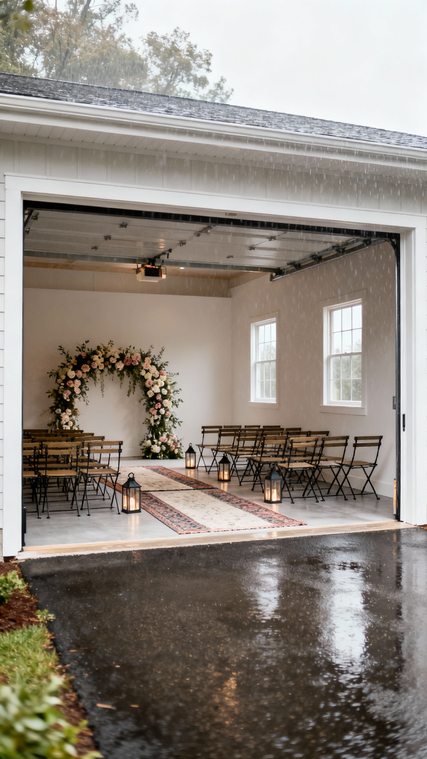Pick a clear rain plan that still feels intentional: a tented patio, garage ceremony setup, or a living-room ceremony with a styled backdrop. Decide the call time (ex: “We switch to Plan B by 10 a.m.”) so you’re not debating under pressure. Stock a few pretty, neutral umbrellas and a couple of outdoor mats so entrances don’t turn into a muddy runway.