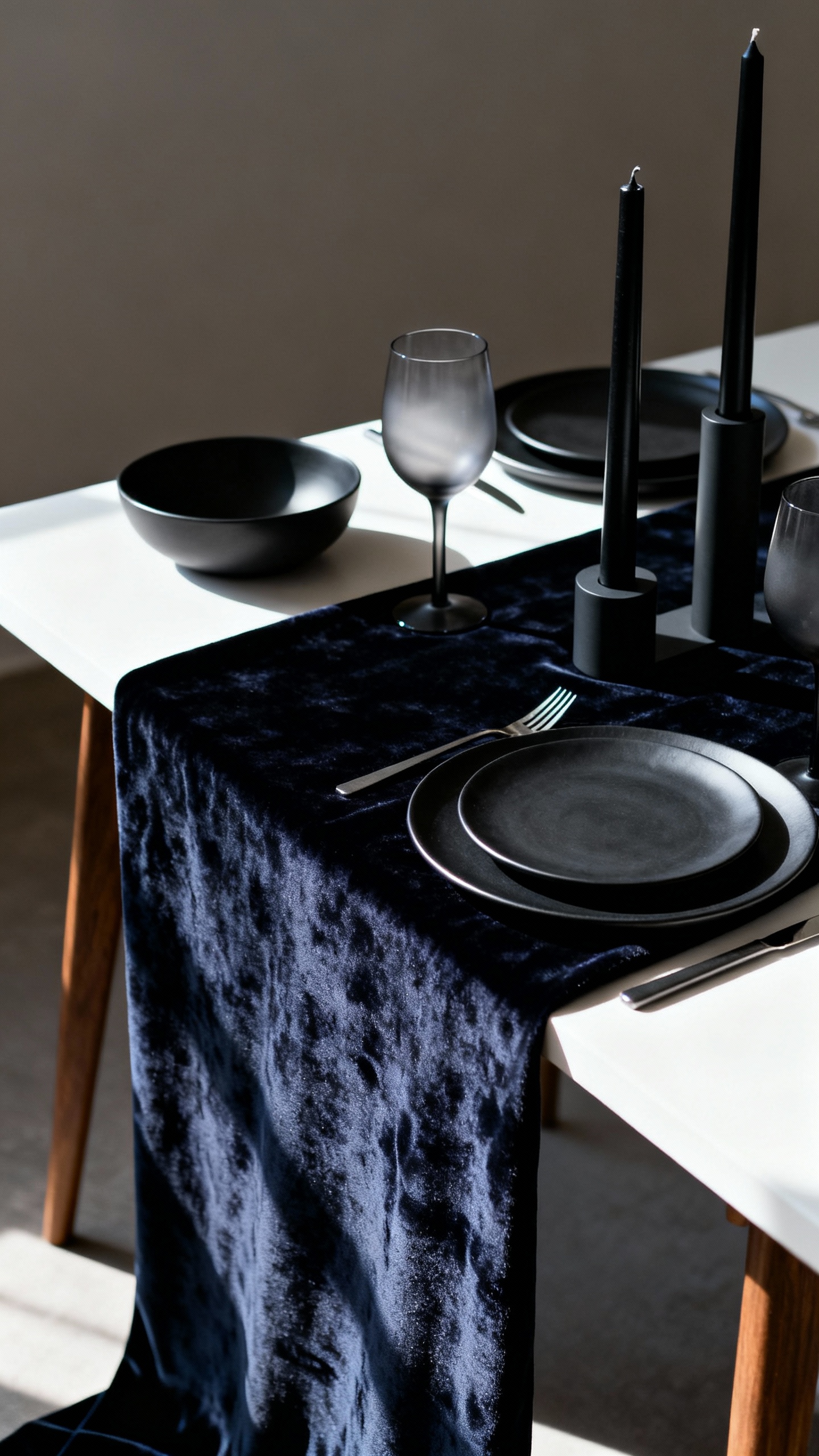 2) Navy Velvet Runner + Smoke Glass + Matte Black Candles