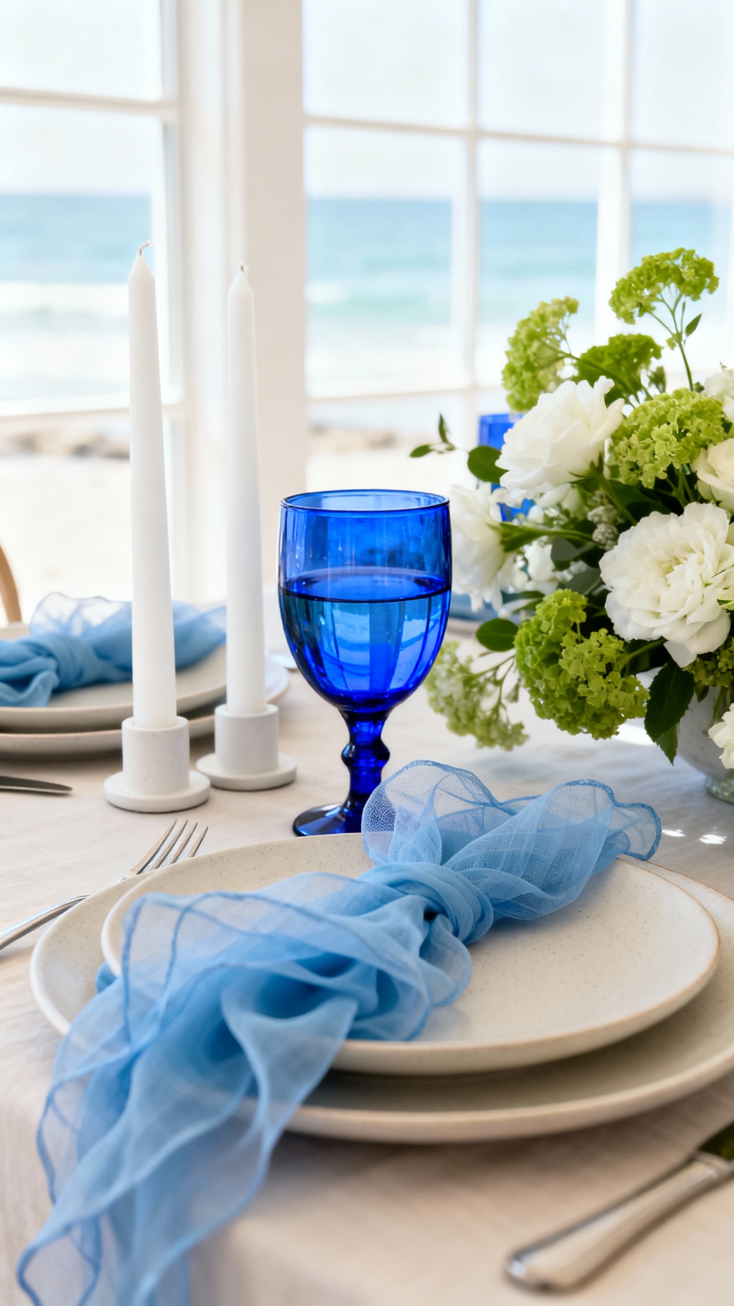 Avoid obvious themed cues like anchors, rope details, and stark navy-and-white stripes. Instead, use blue as a fashion color: pair it with champagne, ivory, black, blush, or amber. Texture (velvet runners, gauze napkins, ribbed glass) also helps the look feel elevated rather than themed.