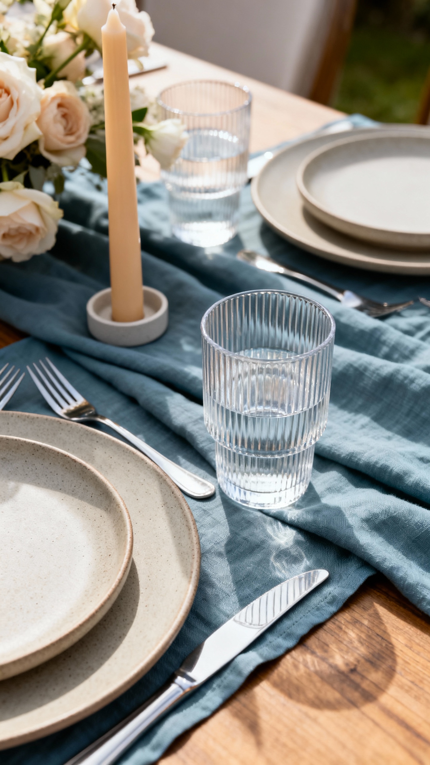 Start with dusty blue napkins or a table runner for that soft, timeless base. Pair it with clear ribbed water goblets to add texture without competing with the color. Finish with champagne tapers in slim holders so the light feels warm (not yellow) and photographs beautifully. This combo is perfect for garden, vineyard, or classic ballroom weddings.