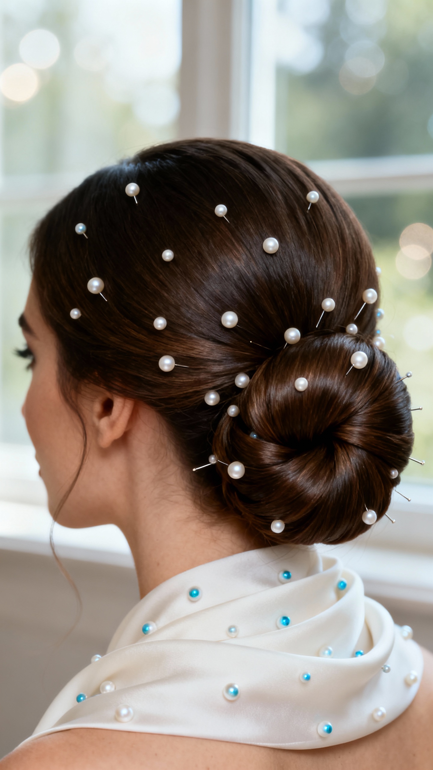 Yes. A low chignon can be created with extensions, a small bun pad, or a hidden hairpiece, and porcelain pins look gorgeous even on a compact bun. For fine hair, prep with texturizing spray and ask your stylist to build structure first (like a teased cushion or pin-curl base) so accessories don’t slide. A comb often holds better than a single stick on very fine strands.