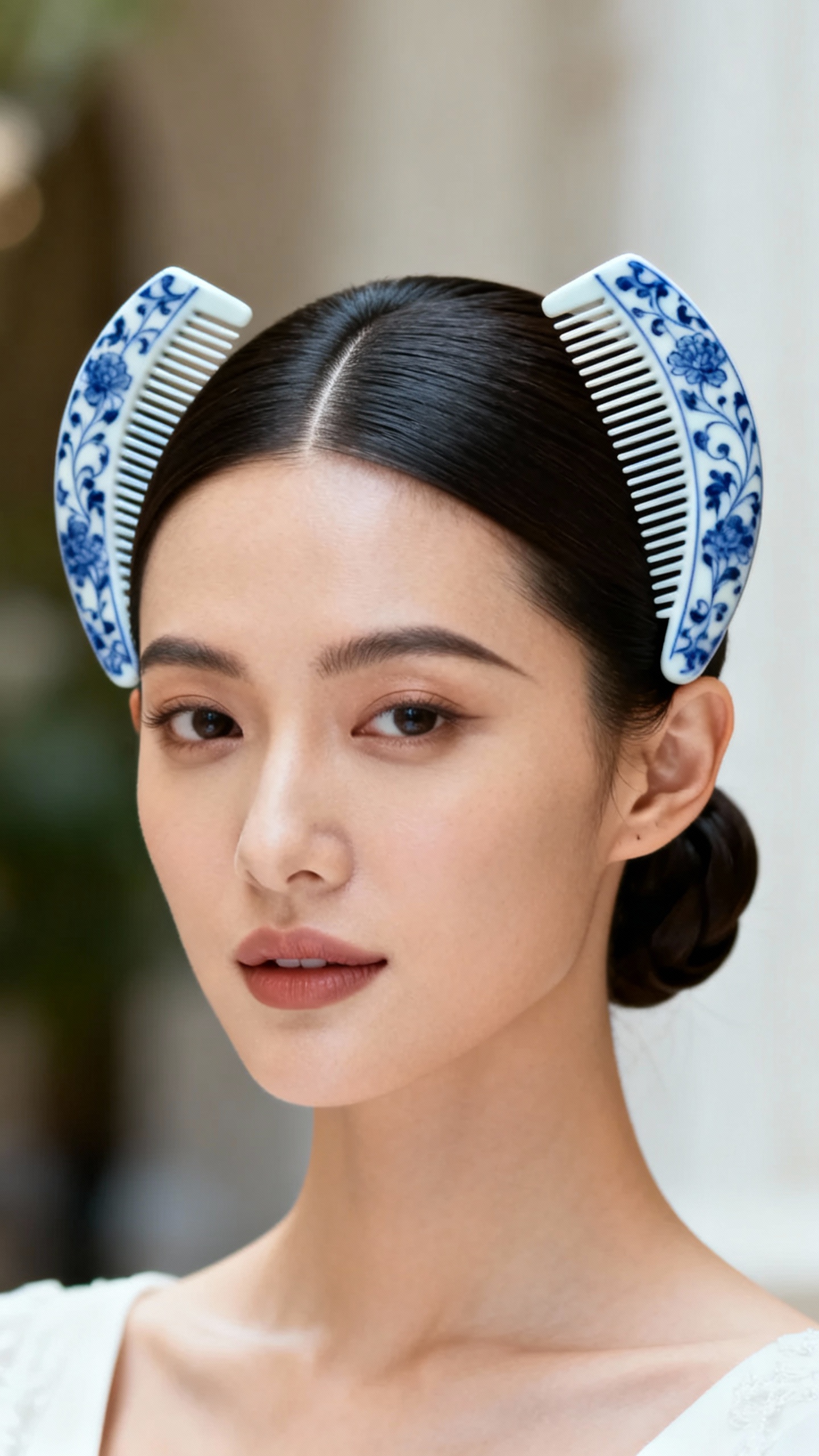 2) Center-Part Chignon with Blue-and-White Hair Combs