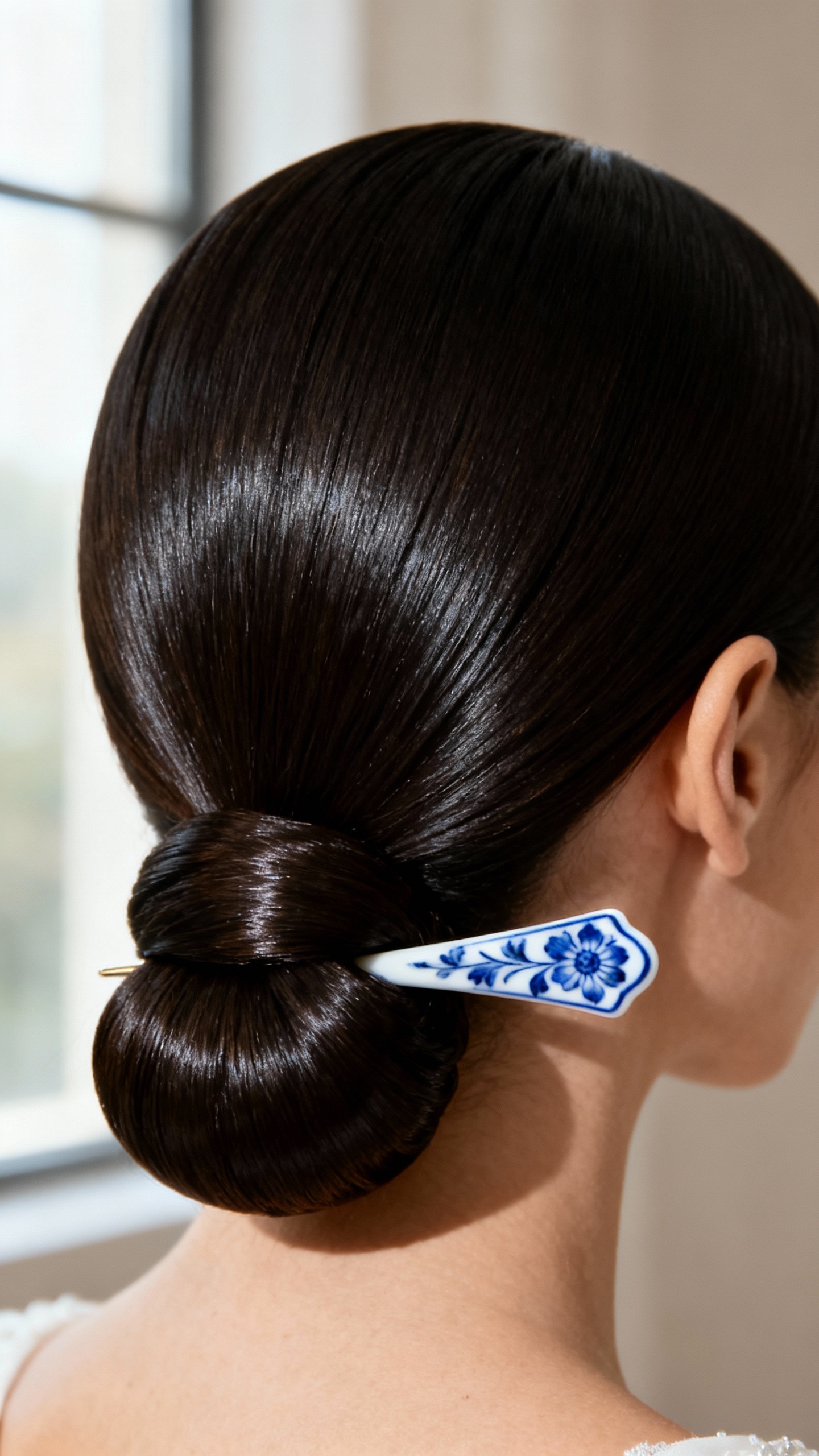 This is the ultimate chinoiserie classic: a glossy low bun with one statement porcelain pin tucked at the base. It flatters oval, heart, and square face shapes because the clean silhouette elongates the neck and keeps everything balanced. The vibe is refined and timeless—like a tea room-meets-estate garden moment. Tip: mist a shine spray over a smoothing cream and place the pin slightly off-center for a modern, editorial finish (and better grip).